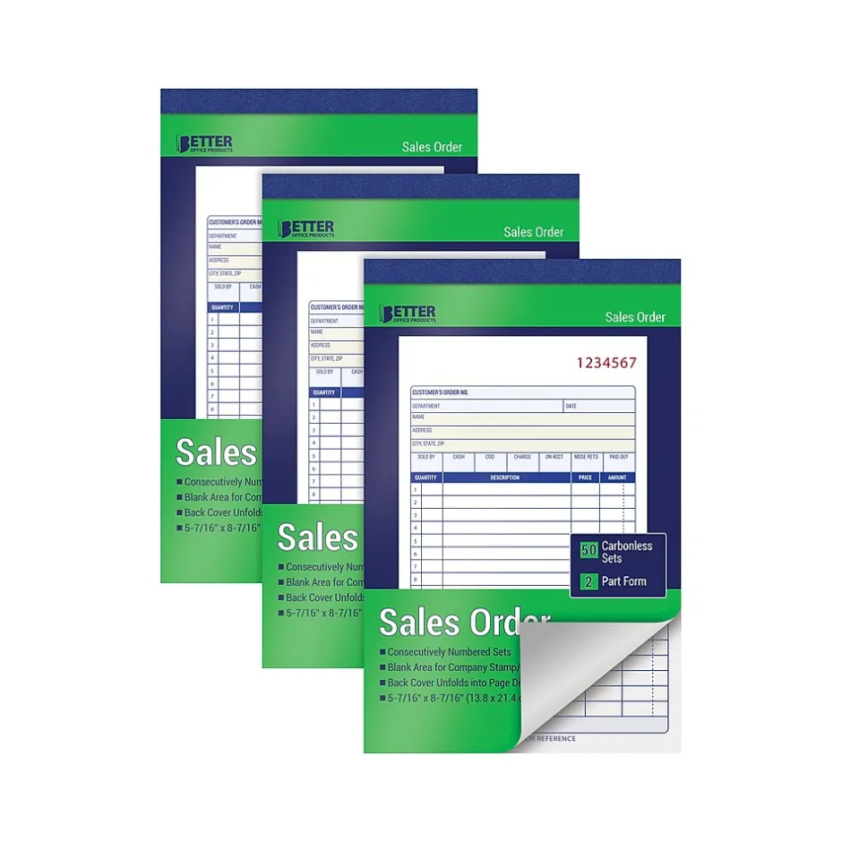 Sales order books are a convenient way to stay organized and track all customer transactions in your business. The Better Office sales order book consists of 50 sets of white (top) and canary yellow (bottom) sheets, with a preprinted sales form that contains lines, columns, and boxes with key word phrases to ensure you are recording the information you need for each sales transaction. The carbonless capture of all text written on the top sheet is instantly and conveniently recorded on the bottom sheet. A thick folded paperboard divider is integrated into the back of the book to use between each two-part sales order sheet.