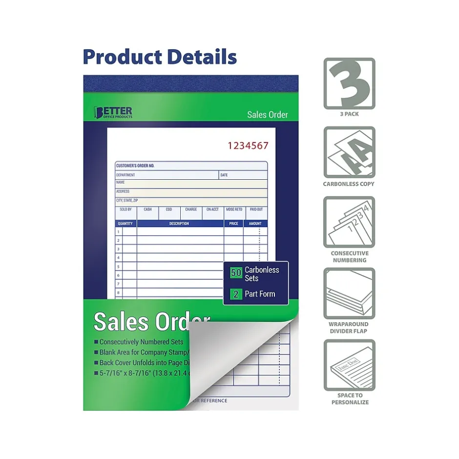 - Effortlessly identify the chronological order of transactions in the book by the preprinted number on each sales order set