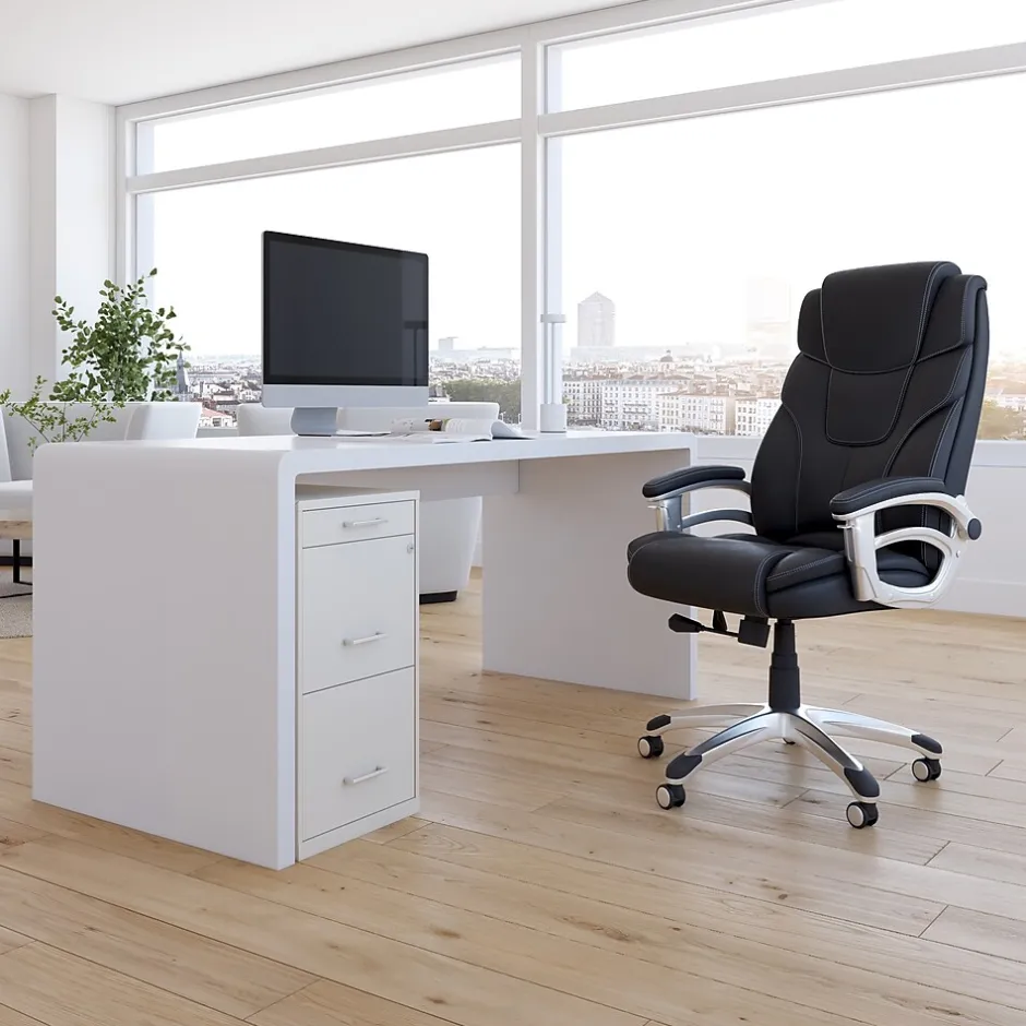 Get a space-efficient solution to recordkeeping and document storage with this three-drawer light duty vertical file cabinet. Ideal for organizing offices, the top drawer provides space for storing supplies, and the bottom two drawers accommodate a large number of letter-size files. The compact design lets this cabinet fit in small spaces, while the white finish and polished handles enhance office decor. This utility file cabinet keeps stored items secure with a built-in lock.