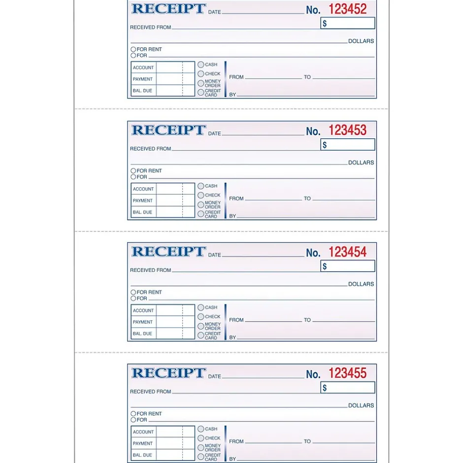 Adams Money and Rent receipt book features carbonless copied canary, pink and white colored backing pages to have a permanent record of each transaction. Receipt book has consecutively numbered pages and is sold as 100 sets per book.