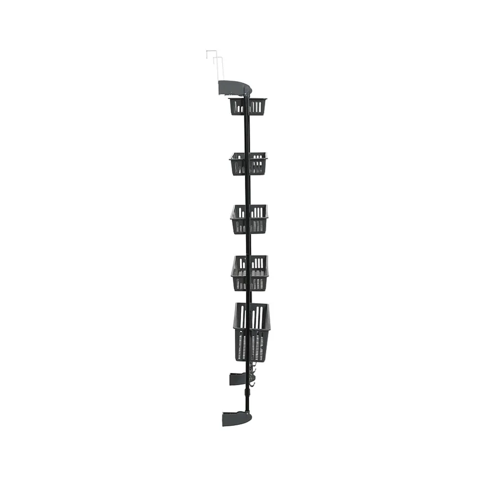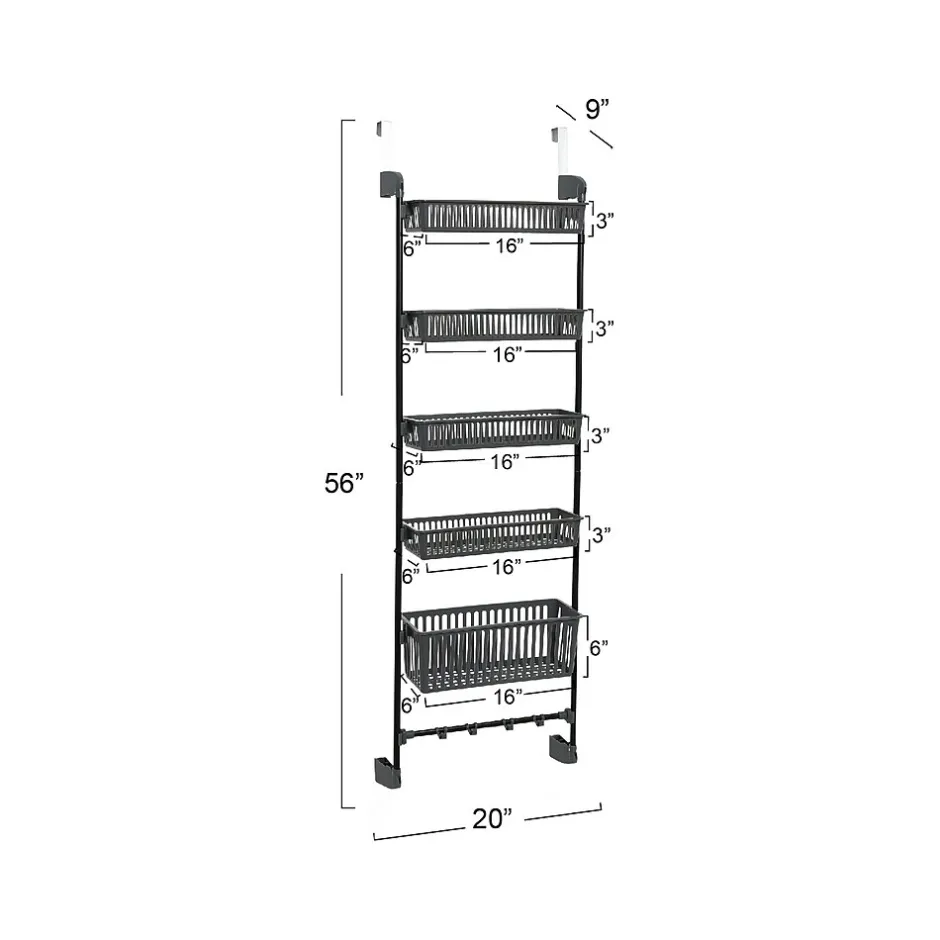 - Five nonadjustable baskets allow storing a variety of items on the back of any door