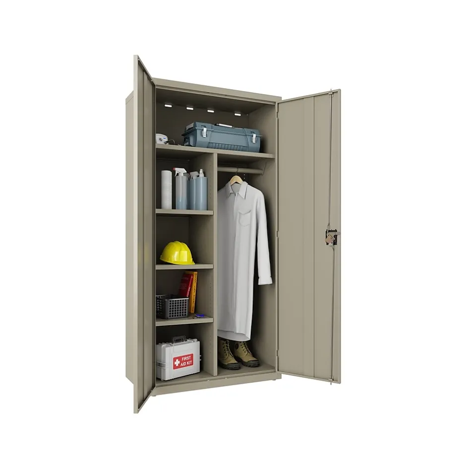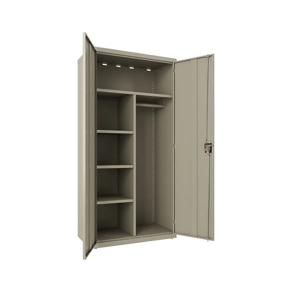 Steel wardrobe storage cabinets provide a concealed storage solution that is useful in various markets including business, industrial, education, hospitality and healthcare. Wardrobe cabinets are a space-efficient, flexible storage solution. This wardrobe has durable, fully welded steel construction. Painted Steel is a non-porous surface that is easy to clean. With three half width adjustable shelves, one full width fixed shelf and a hang rod this cabinet provides flexible storagethat will help keep your essential materials organized. Recessed handle with core-removable lock provides a three point locking system that locks the top, bottom, and doors to keep your items secure. Shelves are adjustable in 1″ increments with 180 lb shelf capacity on the full width shelf and 90 lb capacity on half shelves . Limited lifetime warranty. Unit meets or exceeds ANSI-BIFMA industry standards. Greenguard gold certified.