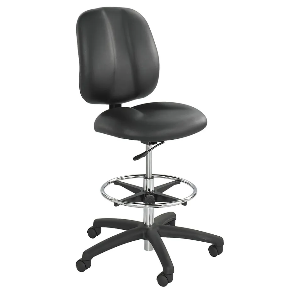 Comfortably attend to standing clients with this Safco Apprentice II extended height chair. With an ergonomically shaped back and built-in lumbar feature, this tall office chair provides comfortable support for your back. To further reduce fatigue, the seat cushion features a waterfall edge to improve circulation. The wrap-around footrest provides relief for your legs and facilitates frequent movement between standing and sitting. Easily change levels with the pneumatic seat height adjustments, and swiftly maneuver between tasks with a full 360 degrees of swivel. The wide base provides the extra stability and safety needed for a high chair. This Safco Apprentice II extended height chair has six casters for easy movement between workstations.