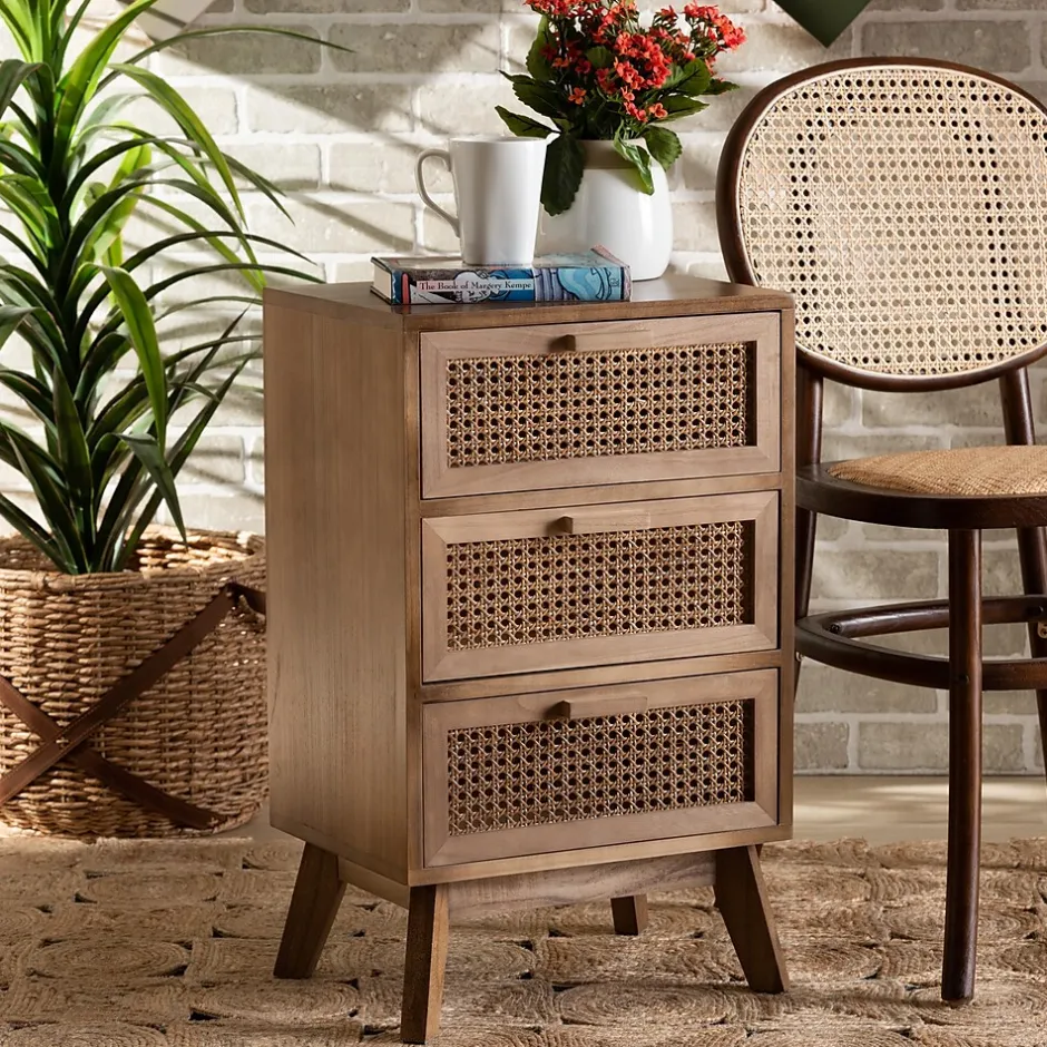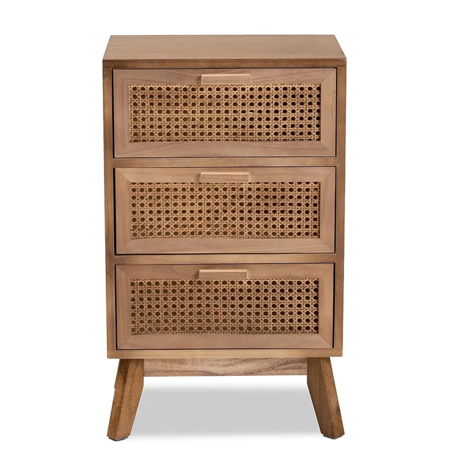 The stunning, retro-inspired design of the Baden nightstand elevates the capabilities of your nighttime routine. Made in China, this remarkable piece is crafted from sturdy wood and adorned with woven rattan drawer faces. Three drawers provide exceptional storage space for your nightly needs and reserve the tabletop for daily use. Requiring assembly, the Baden utilizes sleek, angled legs for stable support that lends classic charm. A fantastic solution for lively homes, the Baden nightstand develops the modern bedroom.This is a product of nature and may have variations in areas such as, but not limited to, color, pattern, grain and texture. The hair-like strands of rattan/rattan-fiber are common due to nature of the material.