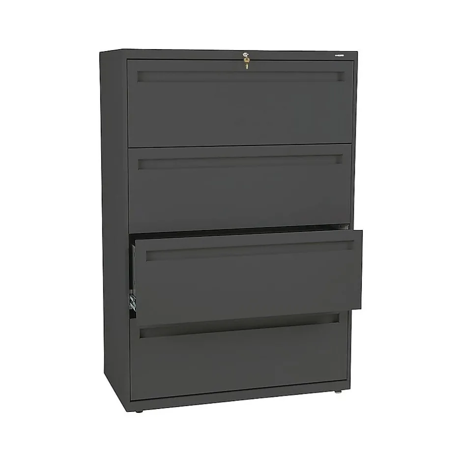 - Four-drawer lateral filing cabinet holds letter- or legal-size documents
