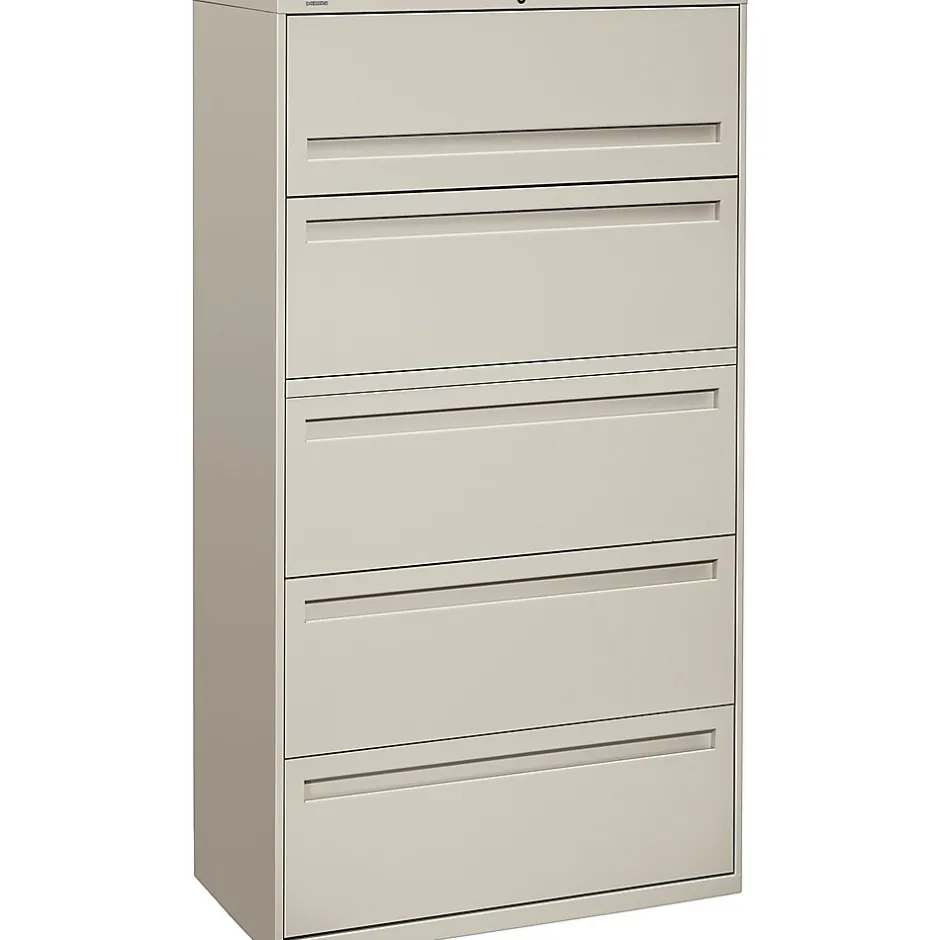 - 5-drawer lateral file accommodates letter- or legal-size files