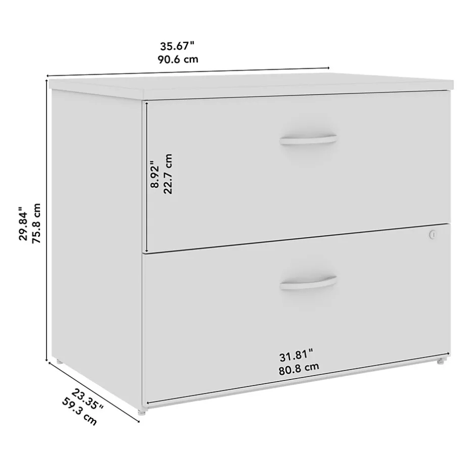 Keep your paperwork under control with the stylish and convenient Bush Business Furniture Studio C 2 Drawer Lateral File Cabinet. Featuring 2 spacious drawers, the filing cabinet ships fully assembled so you’ll be organizing your letter, legal and A4-size documents in no time. Drawers glide on smooth, full-extension ball bearing slides and can be locked to protect sensitive information. Eye-catching Brushed Nickel drawer pulls complement your choice of several contemporary or traditional finishes to make the Lateral File Cabinet as attractive as it is functional. Designed with your comfort in mind, the cabinet matches the height of Studio C desks (sold separately) to extend your workspace when placed side by side. This 2 drawer lateral filing cabinet is backed by a 10 Year Warranty and meets ANSI/BIFMA test standards for safety and performance. American made with U.S. and imported parts.