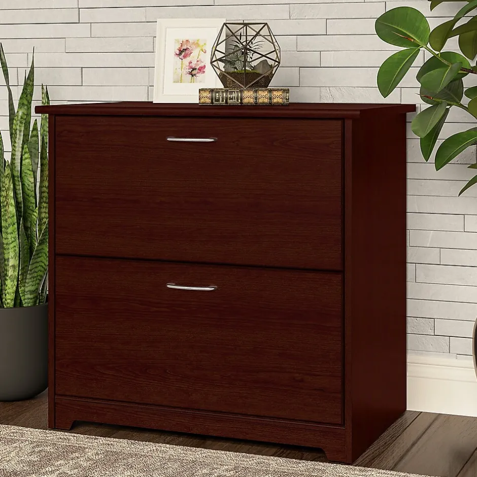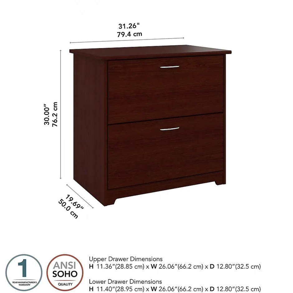 The Bush Furniture Cabot Lateral File Cabinet is a great option to organize important documents in your home office. When used next to the Cabot Corner Desk or L Shaped Desk (sold separately), the 2 drawer File Cabinet serves as an extension to your work surface as they match in height. Featuring two spacious drawers, the Lateral File Cabinet is crafted to hold both letter and legal-size files with ease. Each drawer is fitted with Chrome-finished handles and full-extension ball bearing slides that help with easy reach to the back with a smooth open and close. Quality construction meets ANSI/SOHO test standards for safety and performance. The filing cabinet provides a simple, elegant and timeless appearance, and comes with a 1 Year Warranty. See the full collection for coordinating items.