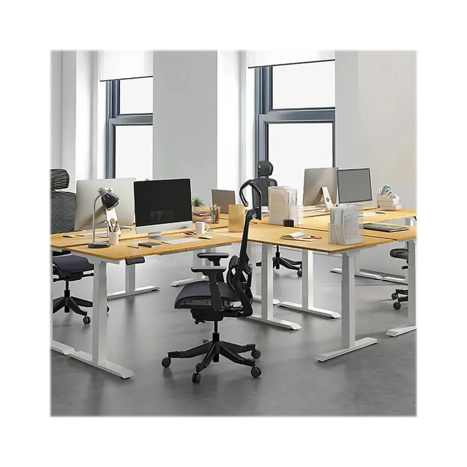 The FlexiSpot E7 is an L-shaped height-adjustable desk with white base and bamboo top. Powered by three motors, the desk can support up to 330 lbs. and travel at 1.5″ per second. Holeless columns are not just attractive, but also prevent the buildup of grease on the moving stages. The anti-collision feature reverses the direction of the desk if an object is struck during movement.