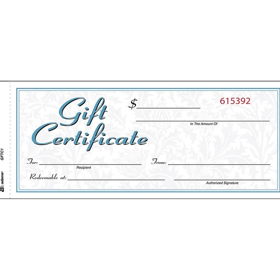 Adams gift certificates offer your establishment a way to enhance gift-giving for any occasion. A cursive-like script and a two-color design make the text stand out, while several blanks show vital information about each certificate.