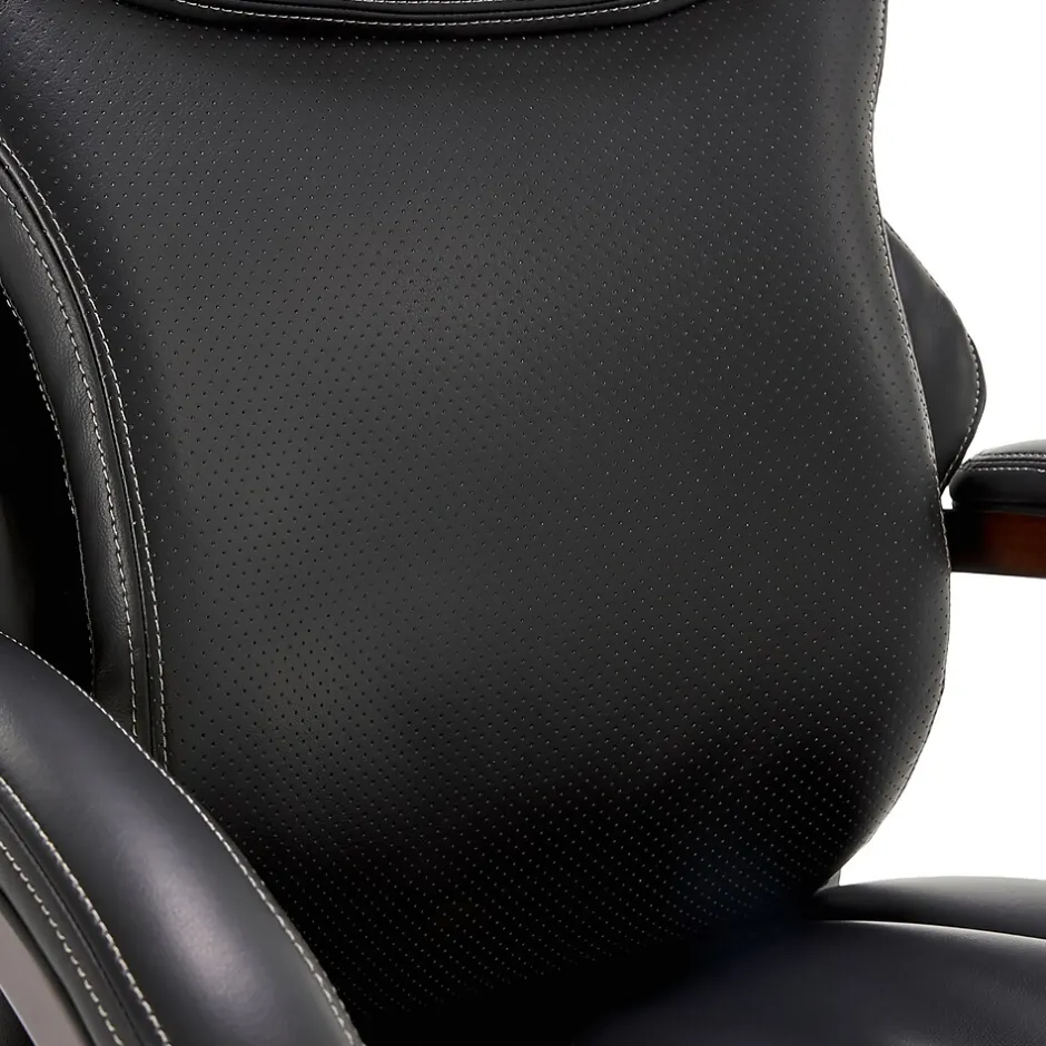 Trusted Quality and Craftsmanship From a trusted brand known for quality, traditional craftsmanship and comfort, the La-Z-Boy Hyland ComfortCore Traditions AIR Technology Executive Office Chair delivers advanced performance for exceptional support and comfort at work and play. Superior Comfort Technology The ComfortCore Plus with Memory Foam advanced layering system offers unique zone-based support, placing cushioning in the areas you need it most. The strategically-assigned plush body pillowing and padded headrest on this office chair combine to provide neck support and minimize pressure points for relief from discomfort caused by prolonged sitting. Ergonomic Design and Lumbar Support Technology This Wellness By Design series La-Z-Boy office chair uses flexible AIR Lumbar Technology that pivots and conforms the lumbar area according to your movement, helping to improve posture, reduce discomfort and provide superior back support. This ergonomic chair is fully adjustable, letting you control height, tilt and lift to suit your needs for customized positioning and optimized body alignment. Built to Last This executive office chair features a thicker plywood subcore, reinforced back bar and heavy-duty castors for durability you can count on for all your day-to-day activities. Traditional Style, Contemporary Functionality Crafted with wood components, this high-back office chair with hand-sculpted arms is upholstered in soft bonded leather to create an elegant blend of traditional style and modern performance that is ideal for any office, home or entertainment space.