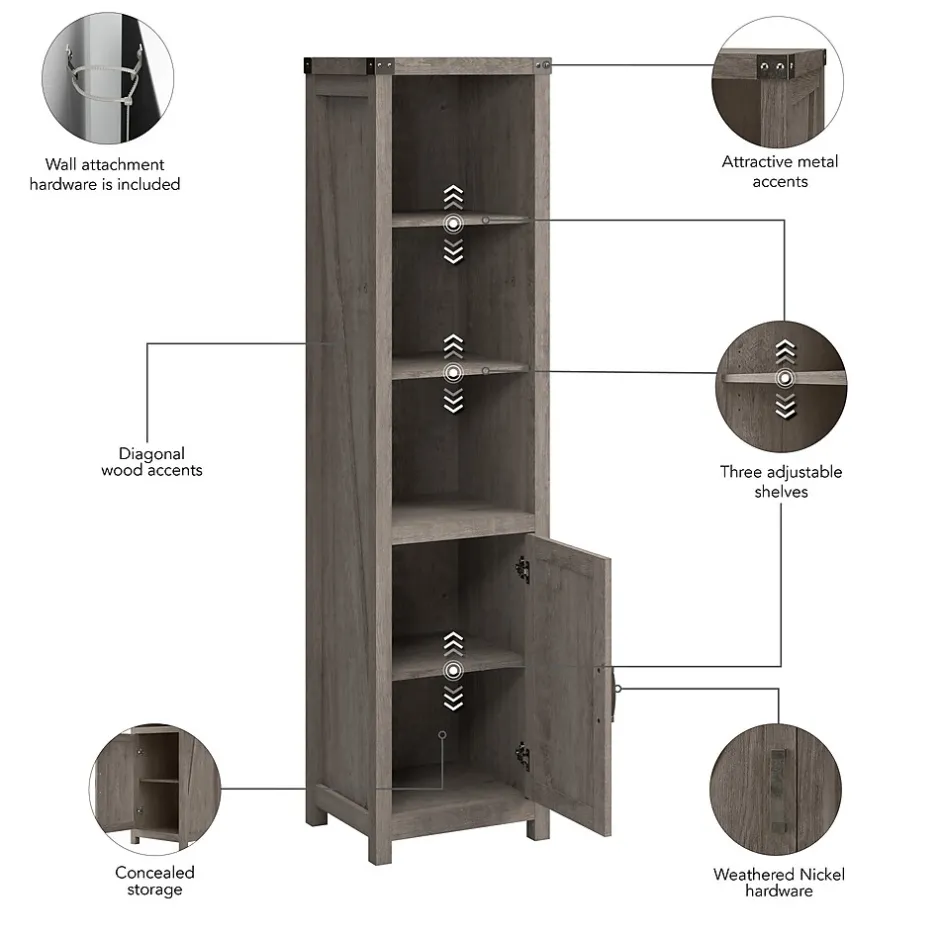 The Bush Furniture Knoxville Tall Narrow 5 Shelf Bookcase with Door offers a practical storage and display solution with appealing modern farmhouse style. Use the top of the bookshelf to brighten up any room with pictures and decorations or organize a collection of paperback and hardcover books. Two of the upper shelves can be raised or lowered to accommodate items of various sizes, and the bottom storage cabinet also contains an adjustable shelf so larger materials can be kept in order but out of sight. Each shelf supports up to 50 pounds. Hardware is included to anchor the narrow bookshelf to a wall for maximum stability in your home office, living room, entryway or any other residential space. This Tall Bookcase has been tested to meet ANSI/SOHO quality standards for safety and performance and is backed by the Bush Furniture 3 Year Manufacturer’s Warranty.