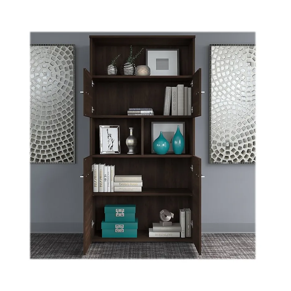 - Tall bookcase features two cabinets for concealed storage along with plenty of open space to display pictures and decorations