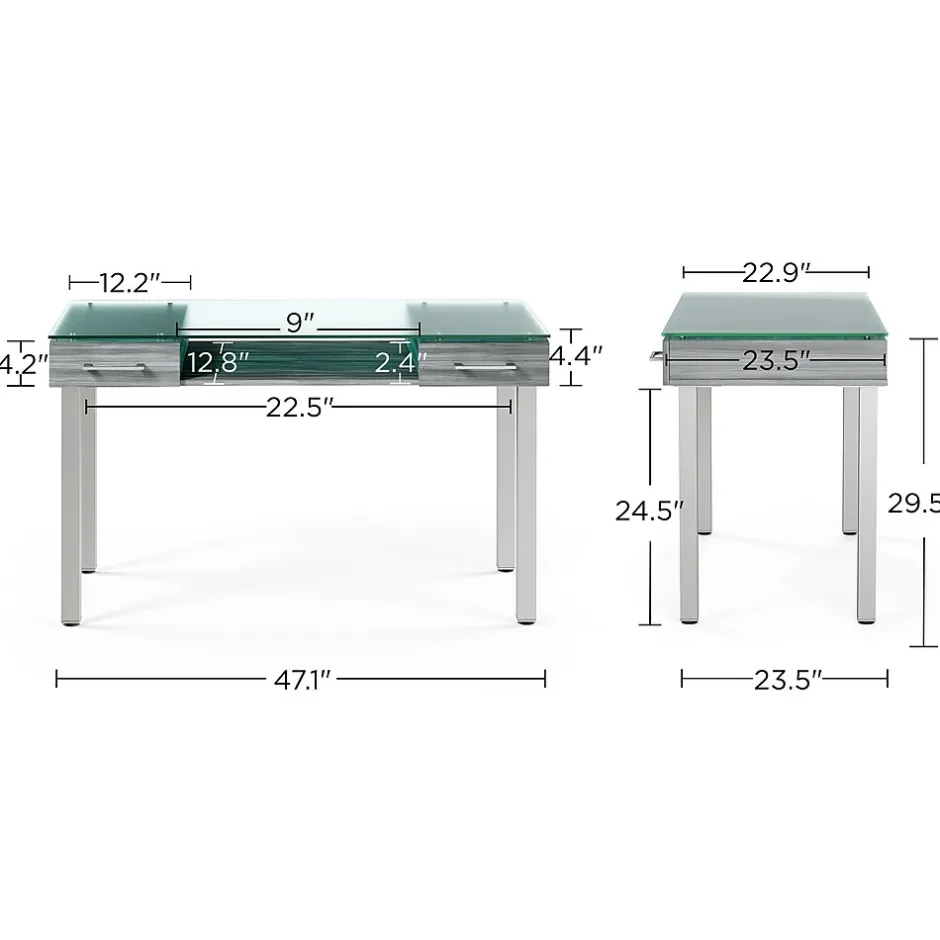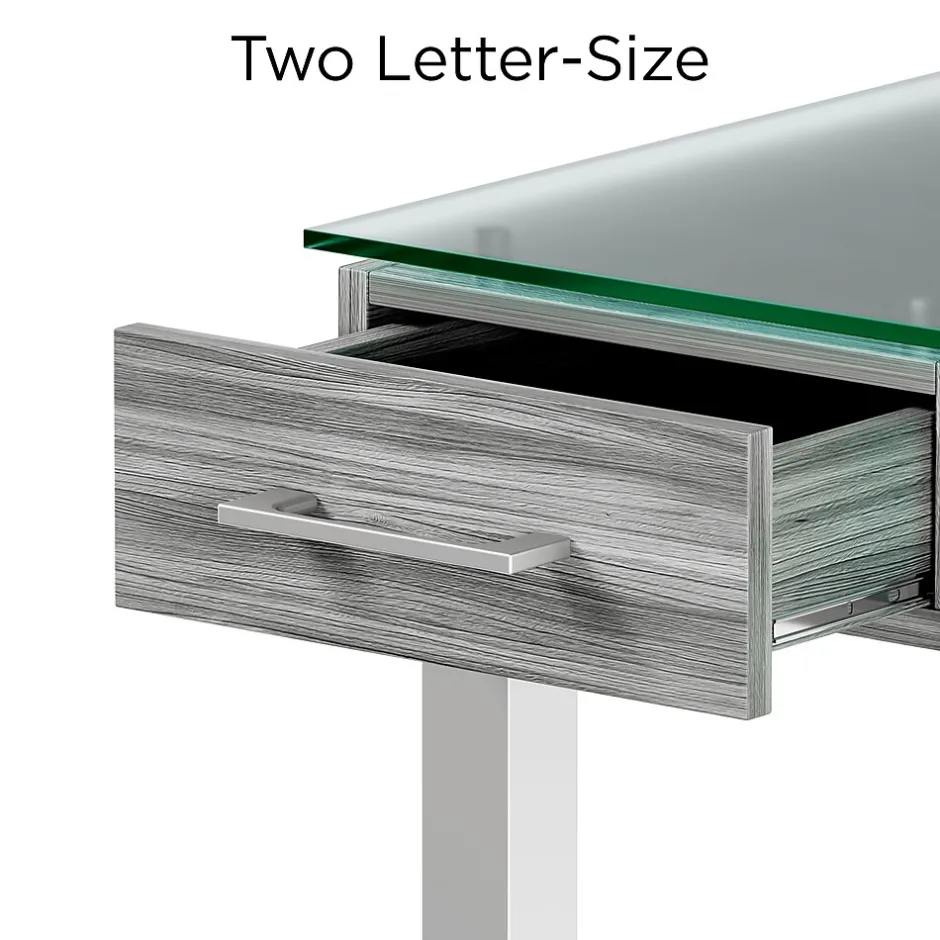 Combine sophistication and functionality when you add this desk to your office. The gleaming frosted glass desktop delivers a modern look and a smooth writing surface, while the two letter-size drawers provide discreet storage for office supplies and paperwork. A thoughtful open design underneath provides space for additional desk components to create a custom setup. This Union & Scale™ Prestige desk boasts a neutral color scheme to coordinate with your existing office decor and features metal legs for added strength and stability.
