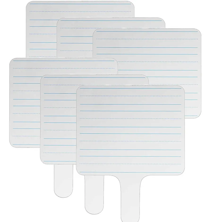 The two-sided rectangular dry erase writing paddles are ideal for quick responses or lessons. One side features lines for handwriting practice or sentence structures, reverse side features a blank dry erase side. Measures 7.75″ x 10″, and 1/8″ thick. Sold as a pack of 6 paddles.