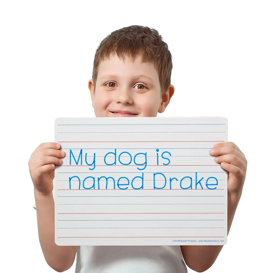 Ideal for teaching and practicing fundamentals at the early learner stage! Each bright white board contains 5 sets of blue headline and broken mid-line plus red baseline format. Each line set measures 1-1/8″ with 3/8″ of blank descender space between sets. Back side is plain white dry erase. Boards feature a non-ghosting dry erase surface with smooth, rounded edges and corners for comfort and safety. Measures 12″ x 9″ x 0.125″ thick. Class pack includes 24 boards.