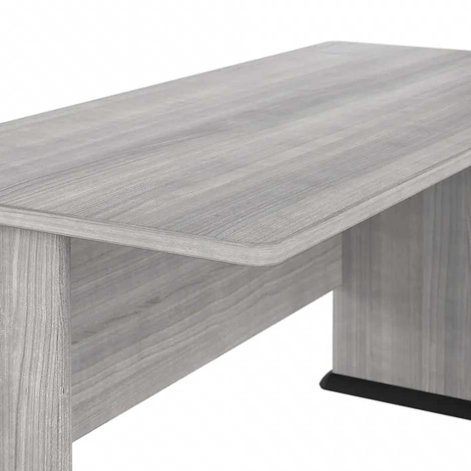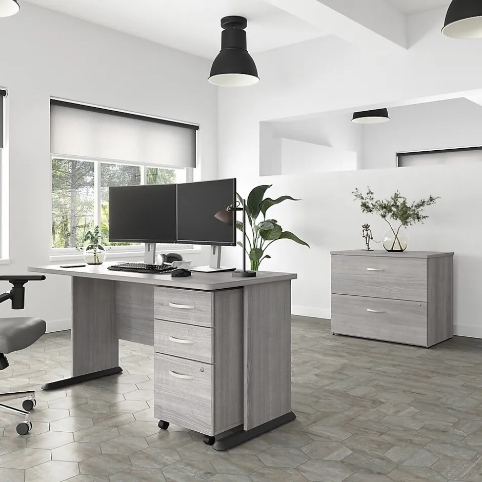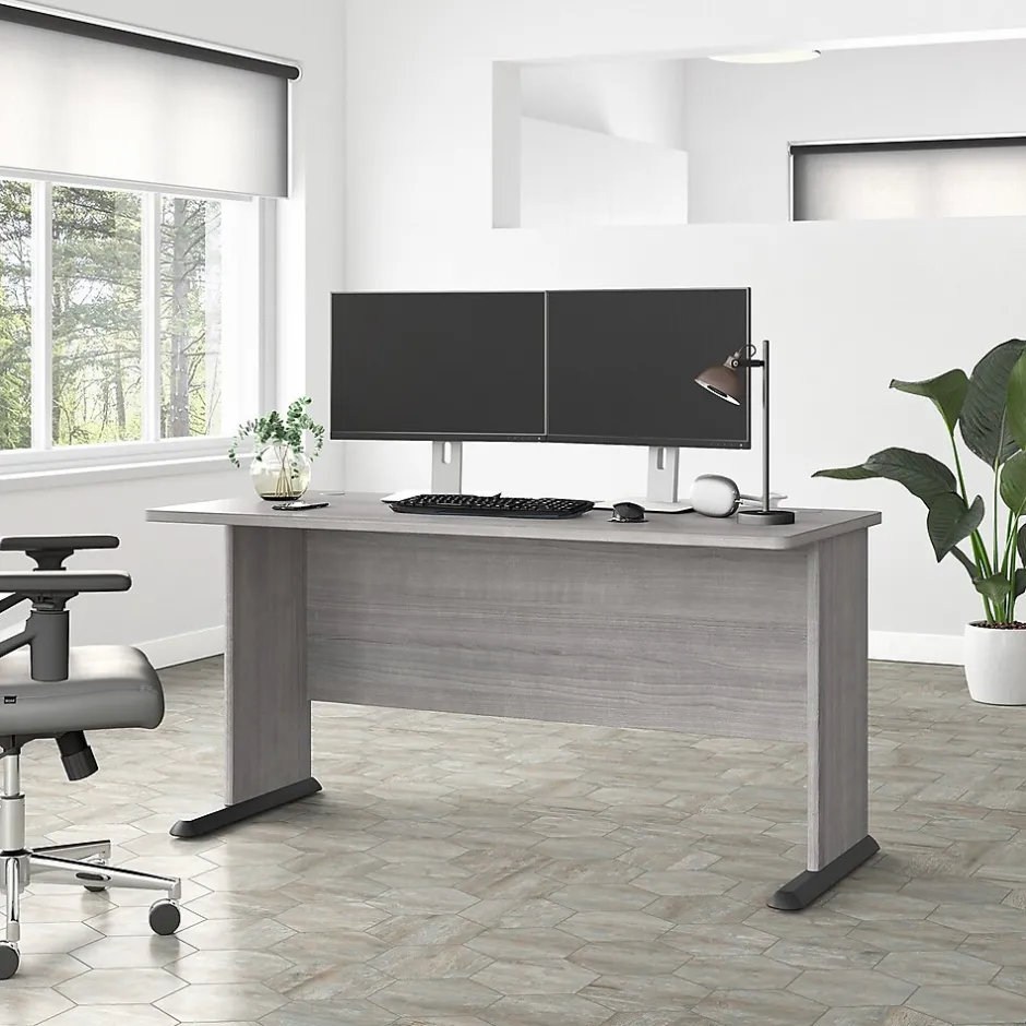 The Bush Business Furniture Studio A 60″W computer desk combines a fresh contemporary appearance with the commercial-quality construction needed to withstand years of everyday use. A spacious work surface makes this large desk a perfect choice for professionals and gamers who prefer having ample room to spread out. Set up with a computer and equipment on the durable thermally fused laminate desktop that supports up to 200 lbs. Two built-in wire management grommets keep cords and cables in order, so the surface remains free from unnecessary clutter. Wall attachment hardware is included for maximum safety and security in any home or professional office. This long desk has been meticulously tested to meet or exceed the ANSI/BIFMA quality standards for safety, durability, and performance and is backed by a 10-year manufacturer warranty. American-made with US and imported parts.