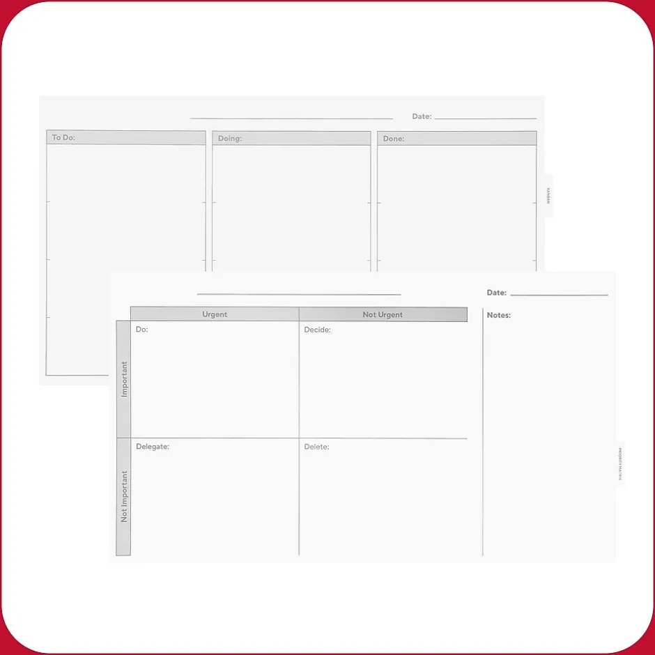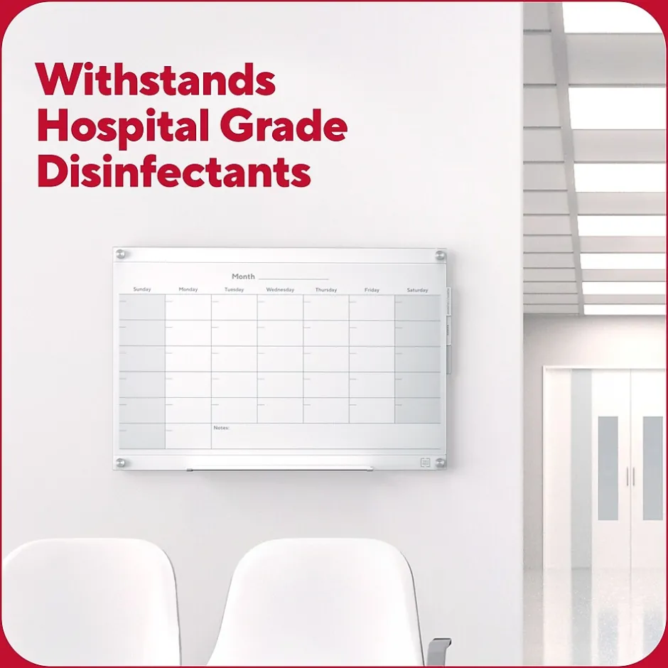 Manage schedules or deliverables, run brainstorms and collaborate or keep your team organized with three, durable double-sided templates. Easy-pull tabs make it easy to swap between templates. The rear template storage compartment allows for easy access to templates and convenience. This TRU RED™ Templated Glass Board is intended for heavy use, so it can be used with hospital grade disinfectants and it won’t stain. Additionally, the magnetic backboard allows users to attach documents or visual aids, helping to improve workflow and productivity.