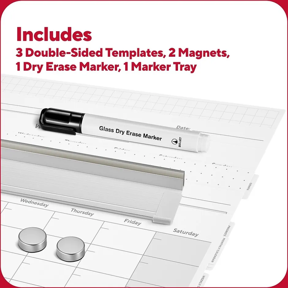 - Includes 1 black dry erase maker, 2 high-powered magnets, and accessory tray