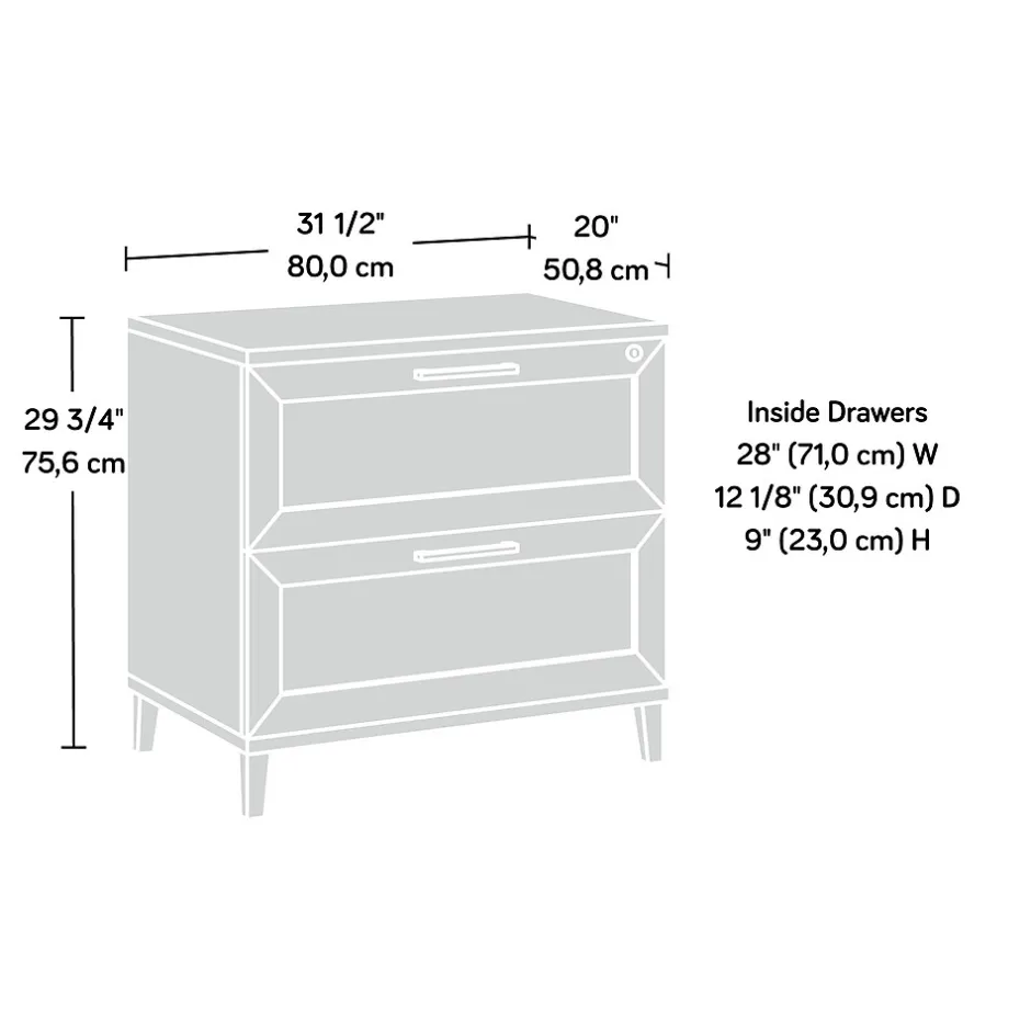 A traditional, yet modern addition to your home office is just a click away with this office filing cabinet from the Tiffin Line collection. This 2-drawer lateral file cabinet features large drawers with full extension slides that hold letter or legal-size hanging files. The drawer features a key lock for secure storage of your important documents. An interlocking mechanism allows only one drawer to open at a time for extra safety measures. Use the spacious top surface of this legal size filing cabinet to store and display items like a printer, wireless speaker, decorative plants, and photos of your family. Rattan inserts on the drawer fronts create a visually stunning centerpiece to any room. This lateral file cabinet is finished on all sides, so it will look polished from every angle. To ensure durability, it has impact resistant, high-grade thermoplastic edges and meets BIFMA testing standards. Finished in dark Raven Oak, this 2-drawer filing cabinet is a convenient and attractive storage solution for the home.