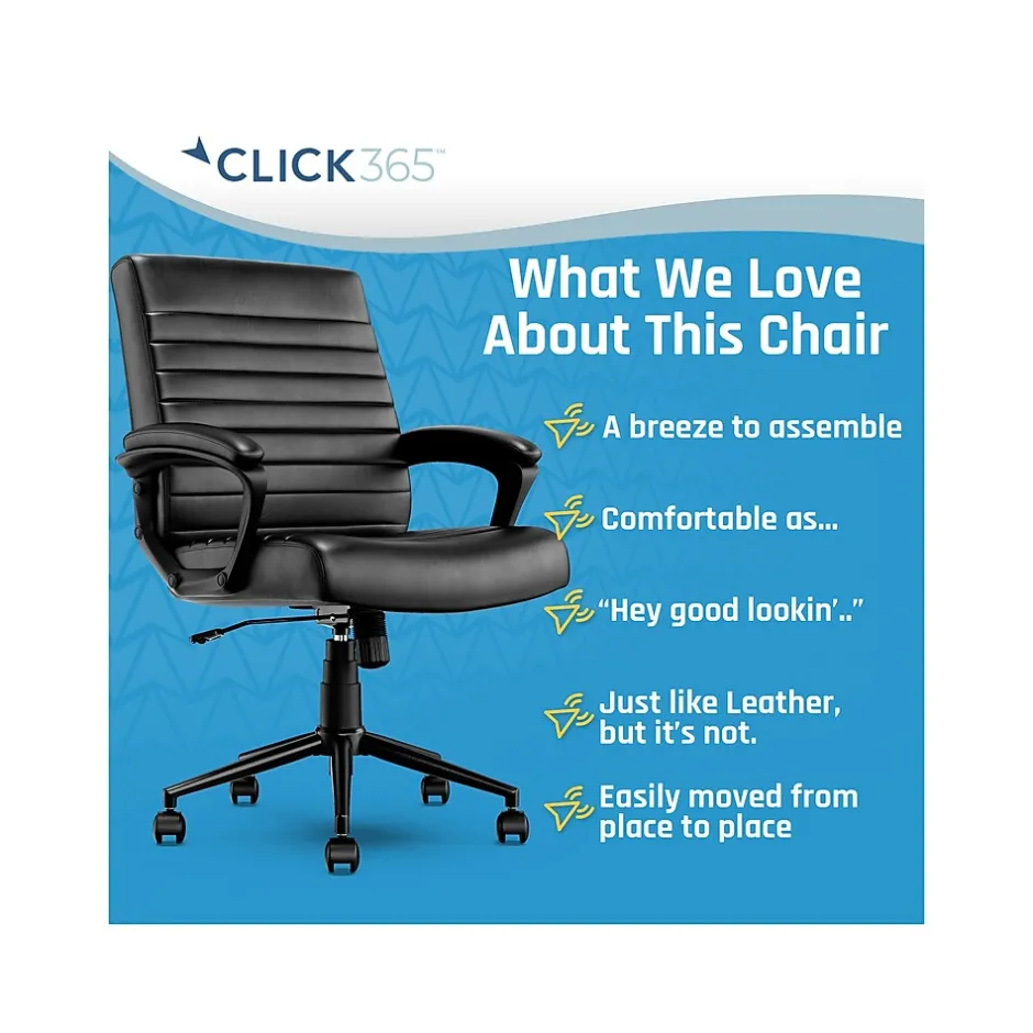 Bring relaxation to your busy workday with the Click365 Transform 3.0 ergonomic mid-back desk chair, which delivers American comfort with ultra plush padding in the headrest, back rest, and seat cushion. This chair has a 5″ thick contoured seat cushion and reliable ergonomic support, providing long-lasting comfort, and is perfect for everyday use at home and in the office. Pneumatic adjustable height, swivel base design, and quality smooth-rolling casters ensure this office chair is easy to move and position. The chair is upholstered in premium durable bonded leather over high-density foam and boasts a heavy-duty metal base and sophisticated stitching. You can purchase this chair with confidence.