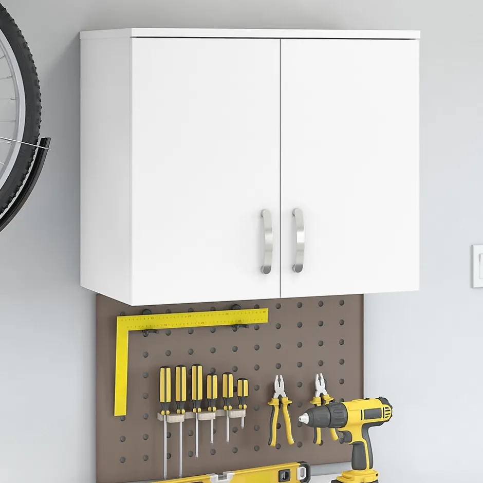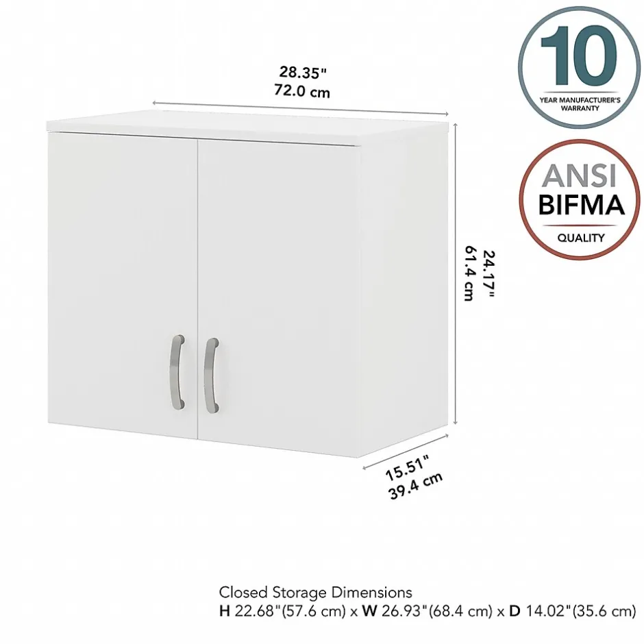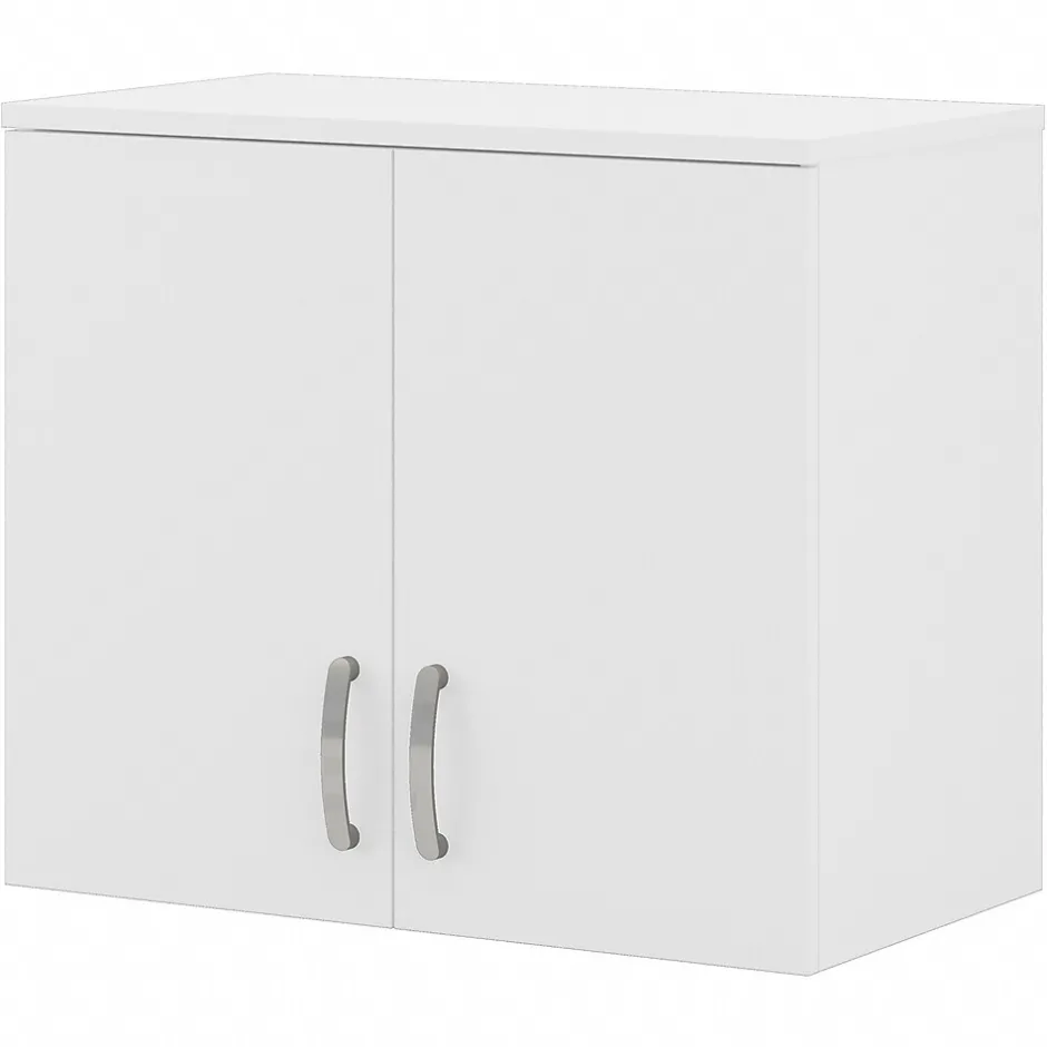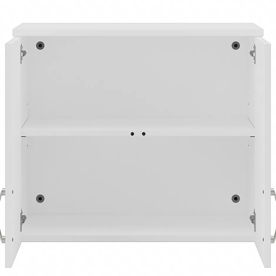 The Bush Business Furniture Universal wall cabinet with doors and shelves features a commercial-quality design and contemporary styling that suits virtually any home or professional environment. Organize your office, break room, garage, laundry room, or any other work or living space with a wall-mounted cabinet that’s built to last and boasts plenty of practical storage capacity. Cabinet doors with smooth Euro-style hinges open to reveal one fixed shelf and one adjustable shelf that accommodate office supplies, tools, and household items of various sizes. The total weight capacity of the small wall cabinet is 30 lbs. For best use, mount wall studs 16″ apart during installation. This wall storage cabinet has been tested to meet ANSI/BIFMA standards for safety and performance and is backed by a 10-year warranty. Complete your space with the full line of Universal modular storage solutions.