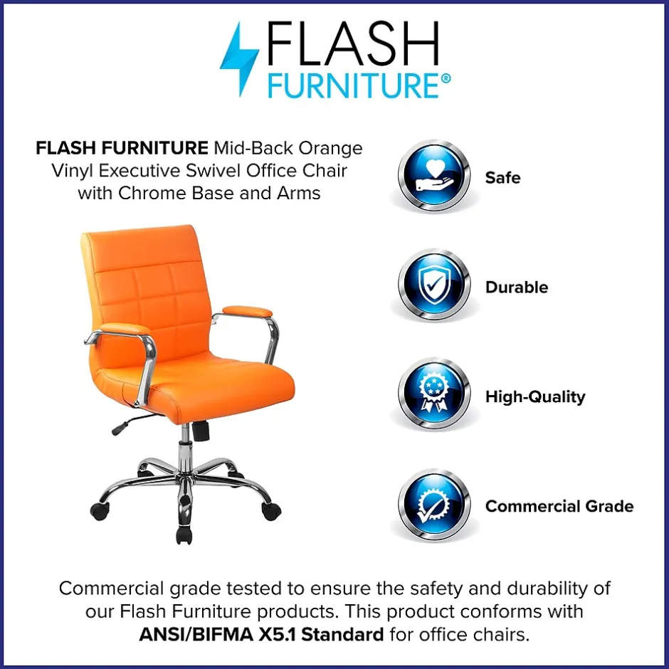 Brighten up your work space with this contemporary mid-back orange vinyl executive swivel office chair featuring designer quilted upholstery. This chair will not disappoint with adequate cushioning to keep you comfortable. The mid-back office chair offers support to the mid-to-upper back region. This chair is ideal for anyone who does a great deal of typing throughout the day and needs good back support. The tilt lock mechanism offers a comfortable rocking/reclining motion. The free rein motion is great for taking a quick break from typing to answer phone calls and relax. The waterfall front seat edge removes pressure from the lower legs and improves circulation. Chair easily swivels 360 degrees to get the maximum use of your workspace without strain. The pneumatic adjustment lever will allow you to easily adjust the seat to your desired height. The chrome base adds a stylish look to complement a contemporary office space.