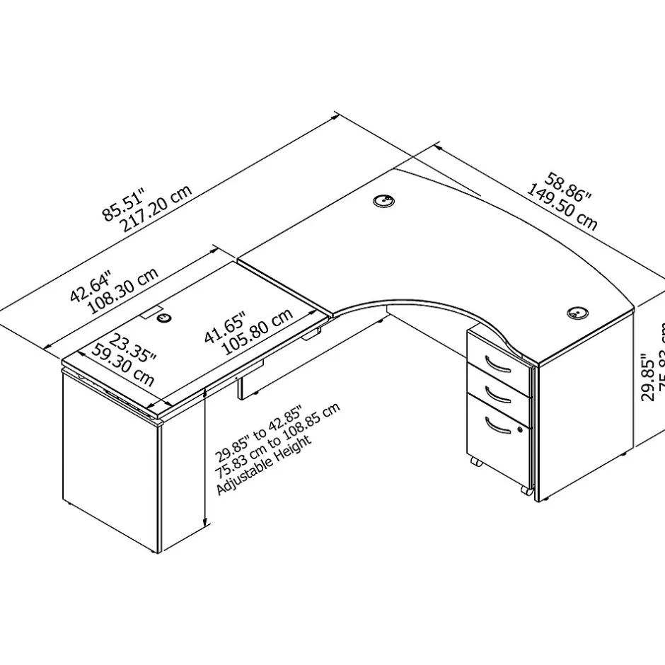 - Bundle includes: 60W x 43D Left Handed Bow Front Desk, 42W x 24D Sit to Stand Return, 3 Drawer Mobile File Cabinet