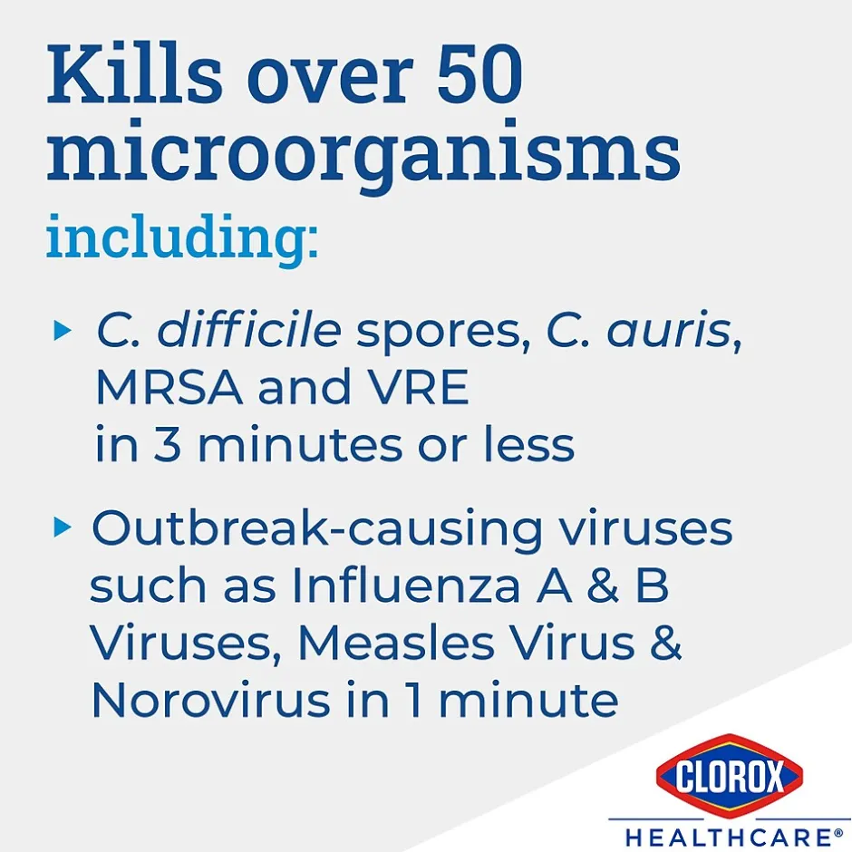 - CLOROX DISINFECTING WIPES: Kill HAI causing pathogens in 3 minutes or less; Proven efficacy against C. difficile* spores, C. auris, outbreak causing viruses, emerging viral pathogens, MRSA and VRE