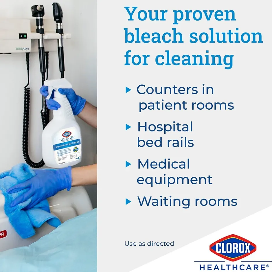 Your proven bleach solution for cleaning. Clorox Healthcare Bleach Germicidal Cleaner is a 1-step cleaner disinfectant that is EPA registered to kill C. difficile* and C. auris in 3 minutes and 50 other microorganisms in 1 minute or less.** This professional germicidal disinfectant contains a 1:10 bleach dilution to meet CDC & OSHA guidelines for disinfecting surfaces in healthcare settings and has proven efficacy against outbreak causing viruses, emerging viral pathogens, MRSA and VRE.Clean, disinfect, and deodorize surfaces with an optimized formula that leaves less residue behind. Use in healthcare settings including hospitals, medical facilities, dental offices, veterinary offices and long term care facilities. *Follow special instructions for cleaning prior to disinfection. **When used according to the disinfection directions. A precleaning step is required to kill Clostridioides difficile and Candida auris. ****Analysis of Clorox Healthcare customer sales data, November 2023.