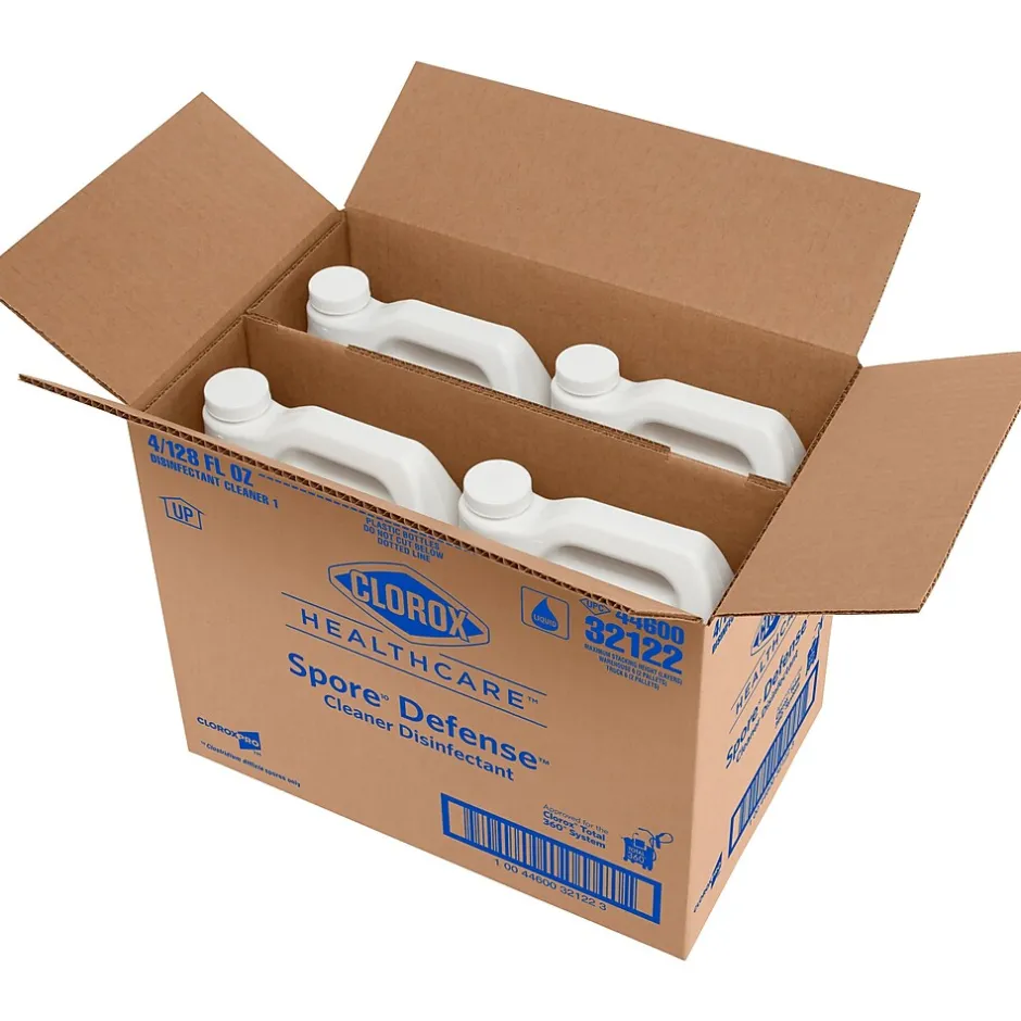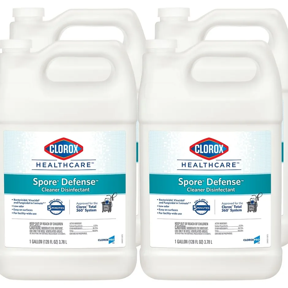 Clorox Healthcare Spore Defense is your low odor, easy on surfaces cleaner disinfectant for facility-wide use. It is intended for use with kills 45 microorganisms including C. difficile spores in five minutes and Bactericidal, Virucidal and Fungicidal in one minute. This Spore Defense cleaner meets EPA criteria for use against SARS-CoV-2, the virus that causes COVID-19. The closed system bottle designed for use with the Clorox Total 360 Electrostatic Sprayer. This one step cleaner disinfectant is compatible with a wide variety of surfaces including acrylic, chrome, aluminum, plastic, vinyl, glazed porcelain, PVC, plastic and stainless steel. Use this spore cleaner for floors, bed frames, infant incubators, showers, stretchers, wheelchairs and more. Most surfaces require spraying until thoroughly wet to meet contact times, let air-dry and then wipe clean. Ideal for use in clinics, doctor offices, emergency rooms, hospitals, patient rooms and more.