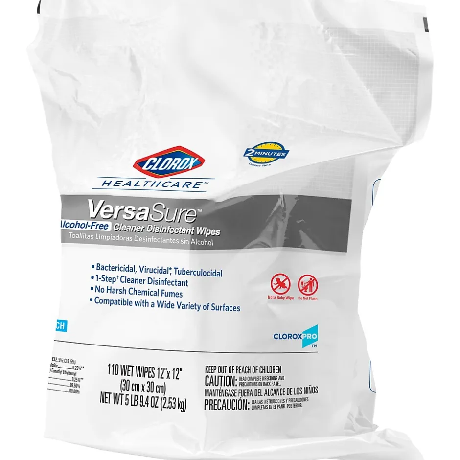 Clorox® Healthcare VersaSure Cleaner Disinfectant Wipes kill microorganisms quickly on a broad range of surfaces. These strong and durable alcohol-free wipes are a one-step solution to cleaning and disinfecting. VersaSure™ wipes are EPA-registered to kill pathogens on hard surfaces in as fast as 30 seconds for most bacteria and viruses. These disinfectant wipes meet EPA criteria for use against SARS-CoV-2, the virus that causes COVID-19. Designed for patient and staff comfort, these wipes are formulated with no harsh chemical odors, fumes, or added fragrances. Available in a variety of wipe sizes to fit a variety of cleaning needs. Intended for use in commercial settings.