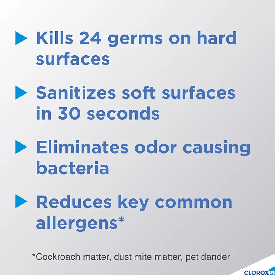 To help keep living and working environments healthy, it’s important to clean and disinfect multiple surfaces, a process that once required multiple products. Clorox® 4 in One Disinfectant & Sanitizer lets you disinfect, sanitize and reduce allergens with a single all-purpose aerosol spray. This powerful cleaner disinfects hard surfaces with 24 EPA-registered kill claims, and sanitizes soft surfaces in as little as 30 seconds. It meets EPA criteria for use against SARS-CoV-2, the virus that causes COVID-19.This disinfecting spray even kills odor-causing bacteria in the air, and leaves behind a refreshing scent. On top of that, Clorox® 4 in One reduces pet dander, dust mite matter and cockroach matter allergens which can trigger allergies and asthma. Ideal for offices, day care centers, schools, hotels, restaurants and other commercial facilities. No precleaning required. CloroxPro™, where clean means everything.