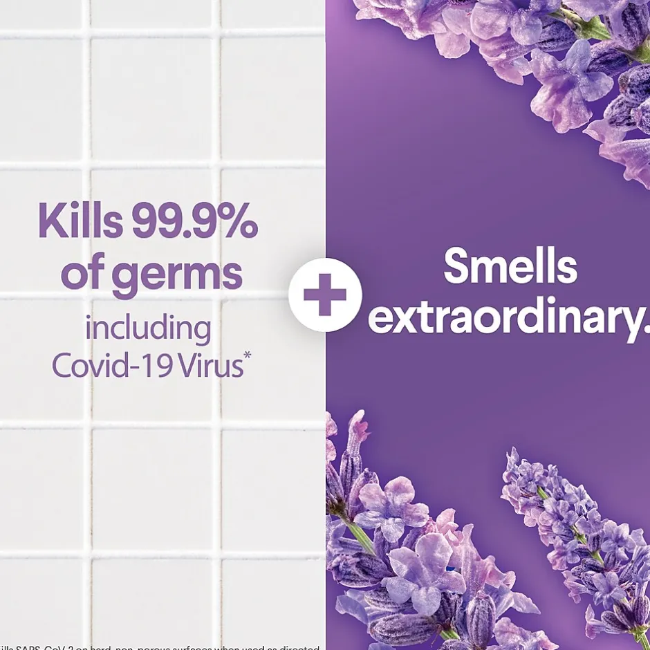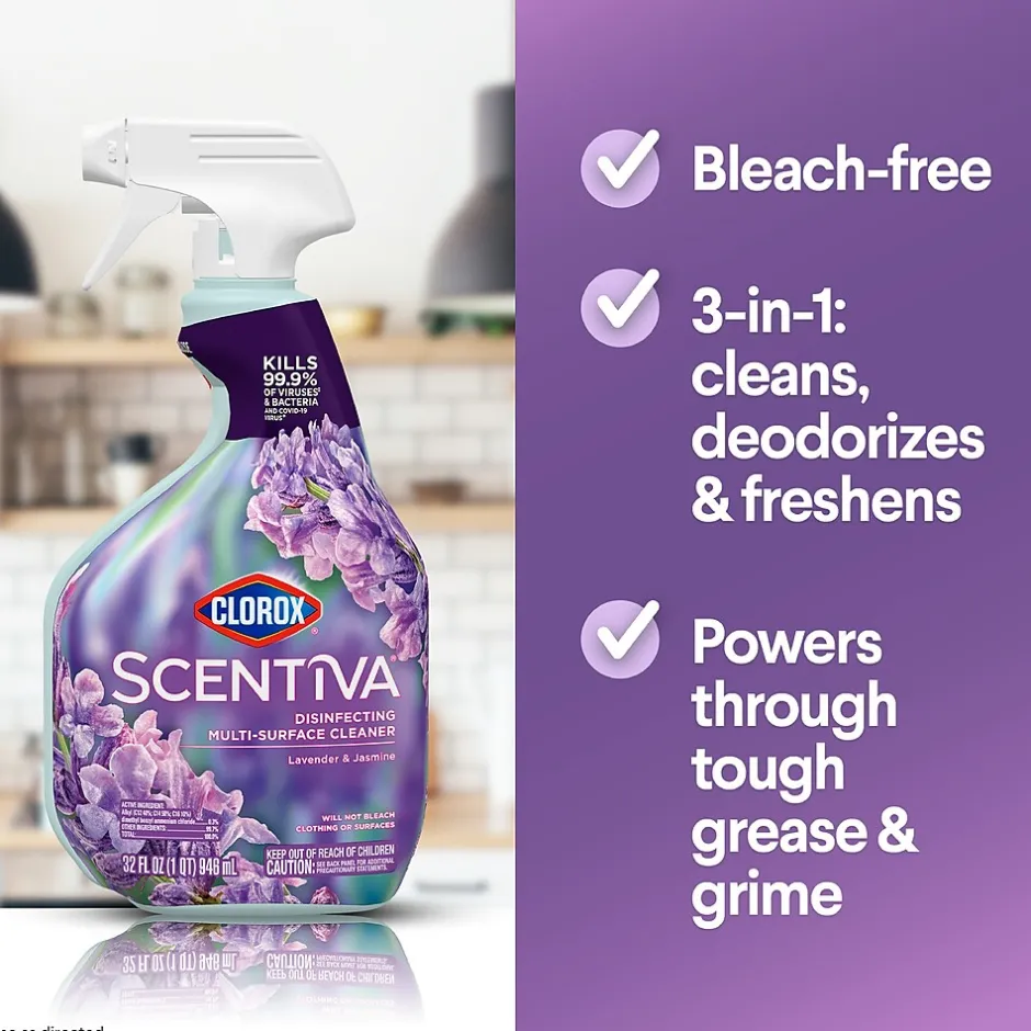 Clorox Scentiva Multi-Surface Cleaner combines the trusted cleaning and disinfection of Clorox with the captivating scent of Lavender and Jasmine to transform your entire home. Clorox Scentiva scents are curated, inviting blends that will elevate your cleaning experience. This multi purpose cleaning spray is bleach free and powers through tough grease and grime with ease. Use this disinfecting spray all around the office, including kitchen counters, cabinets and floors and bathroom toilets, sinks and tubs to quickly spray away an array of messes. Safe to use on most surfaces, including stainless steel, glazed ceramic tile and finished wood, plus around pet areas, Clorox Scentiva Disinfecting Spray cleaner eliminates 99.9% of germs*, including COVID-19** virus, while filling your home with uplifting, long lasting scents. *When used as directed on hard, nonporous surfaces. **Kills SARS-CoV-2 on hard, nonporous surfaces.