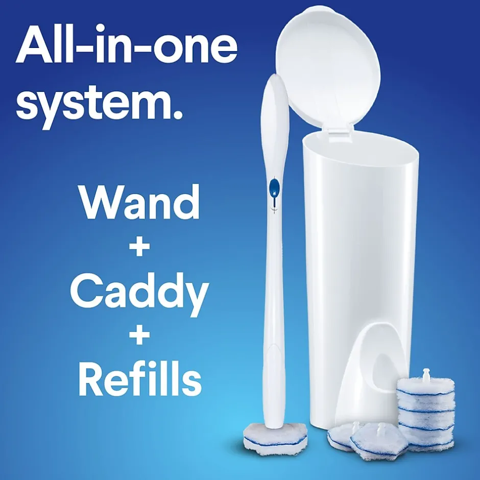 - ALL IN ONE SYSTEM: Contains 1 wand with long handle to help clean from a distance, 6 disposable scrubbing pads preloaded with cleaner and 1 caddy to conveniently store scrubbing pad refills; pack may vary