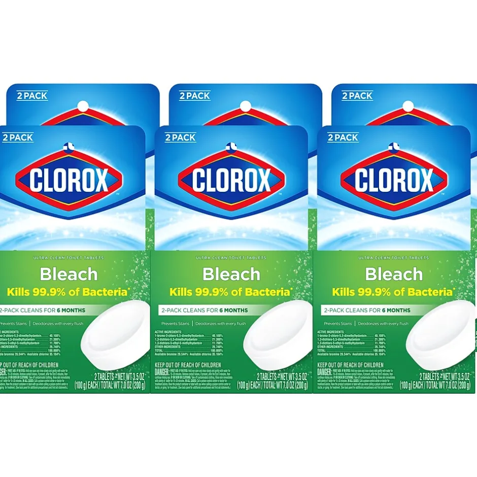 Clorox™ Ultra Clean Toilet Tablets kill 99.9% of bacteria and deodorizes your toilet with the power of Clorox™ bleach. This toilet bowl cleaning tablet, effectively cleans and prevents stains with each flush, eliminating the need to scrub every time. Each tablet delivers a long-lasting bleach clean and is good for up to 3 months. Simply drop a tablet into your toilet tank to continuously sanitize, deodorize and clean your toilet every time you flush. The dissolvable cleaning tablets help prevent tough stains and removes hard water, mineral deposits and limescale stains. Ideal for use in restaurants, cafeterias, offices, hotels, daycares and other commercial facilities. Keep your toilet bowl sparkling fresh and ultra clean with no mess and no fuss with the help of Clorox™ Ultra Clean Toilet Tablets.