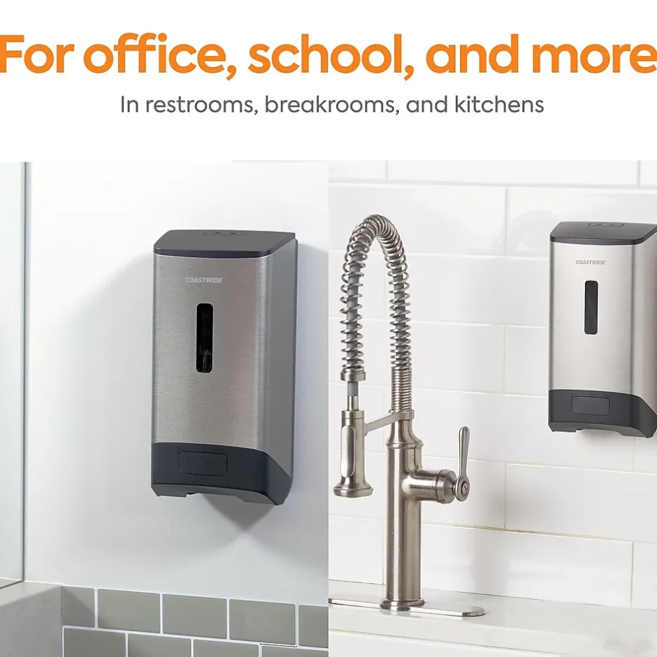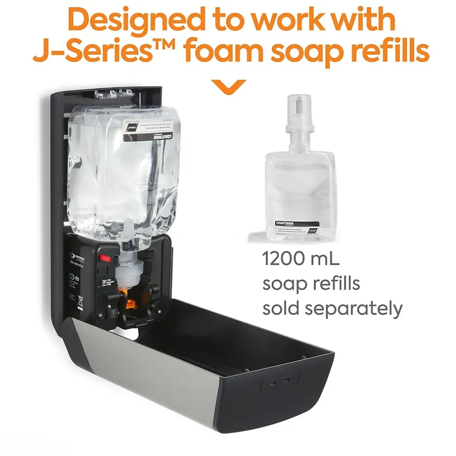 Make handwashing simple with this hands-free electronic soap dispenser. The adjustable output helps control consumption of J-Series foam soap to prevent waste, and the color-coded interior touchpoints make it easy for staff to refill.This Coastwide Professional™ J-Series automatic soap dispenser has a clear window for easy supply monitoring and a back-up manual dispense mode for when batteries run out, to ensure continuous service.Engineered to work with J-Series foam soap.