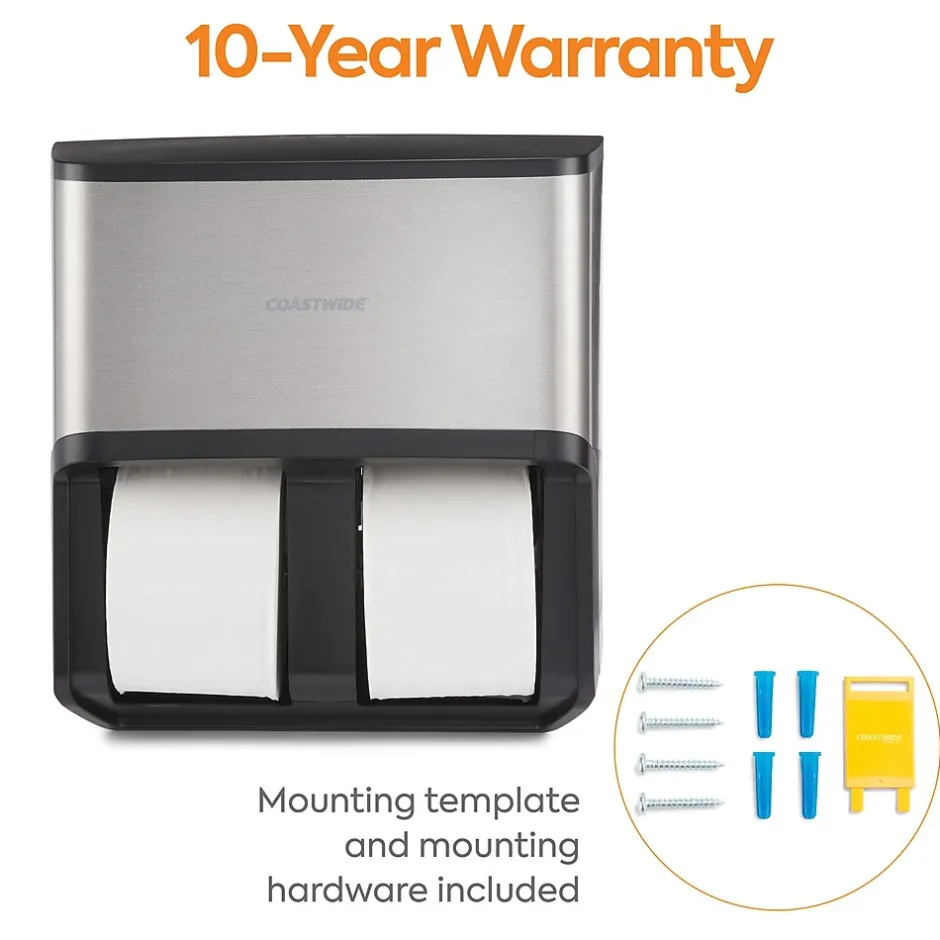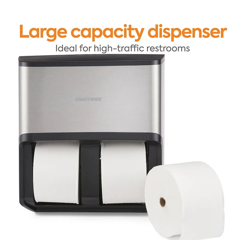 Ensure restrooms are properly maintained with this four-roll bath tissue dispenser. The color-coded interior touch touchpoints make it easy for janitorial staff to keep up with demand and is engineered to work J-Series tissue delivering effortless reloading. A universal key provides quick access to all the dispensers. This high-capacity Coastwide Professional™ J-Series quad bath tissue dispenser holds up to 6,000 sheets of two-ply or 12,000 sheets of one-ply J-Series bath tissue to meet the needs of busy restrooms.