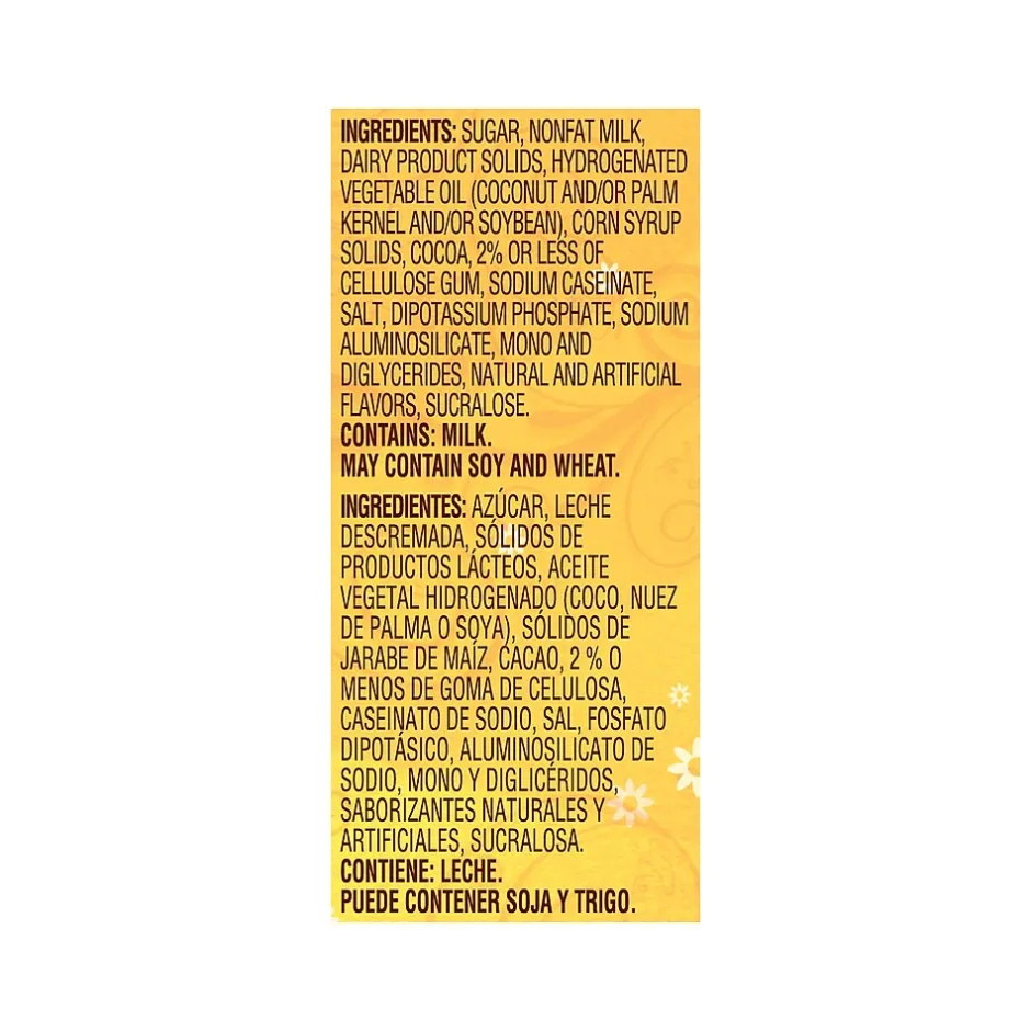 - Ingredients: sugar, nonfat milk, corn syrup solids, cocoa, hydrogenated vegetable oil (coconut and/or palm kernel, and/or soybean), dairy product solids, and less than 2% of cellulose gum, dipotassium phosphate, natural and artificial flavors, sodium caseinate, salt, sodium aluminosilicate, mono- and diglycerides, sucralose