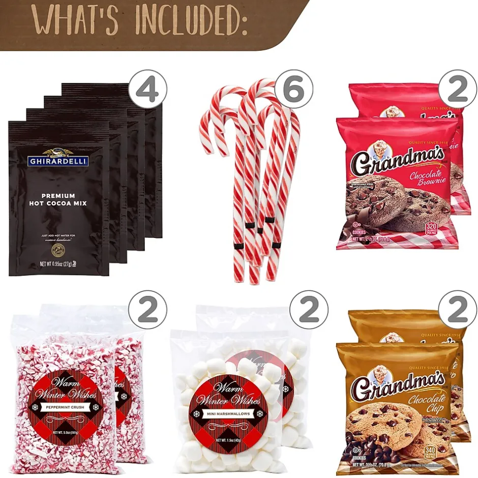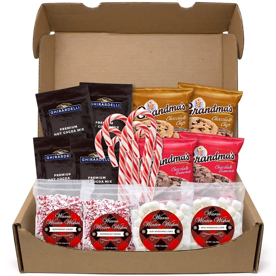 - This box includes 4 packets of Ghirardelli Hot Chocolate, 2 bags of jet-puffed mini marshmallows, 2 bags of crushed peppermint, 6 Spangler Candy Canes, 2 Grandma’s Big Chocolate Chip Cookies and 2 Grandma’s Big Chocolate Brownies