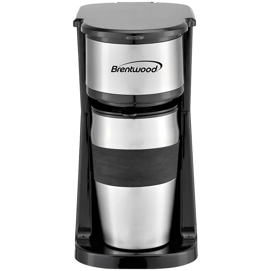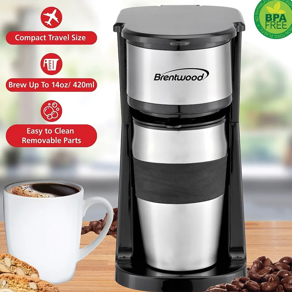 The powerful 700-Watt Brentwood Portable Single Serve Coffee Maker with 14-Oz. Travel Mug is everything you need to start drinking coffee instantly. Just choose your soft pods or grounds, add water, and push to brew up to 14 oz. of single-serve coffee. Save money using the reusable mesh filter cup. Easily fill unit with water with its top-loading lid. The removable filter cup and filter holder make for easy cleaning. The coffee maker, parts, and travel mug are completely BPA-free.