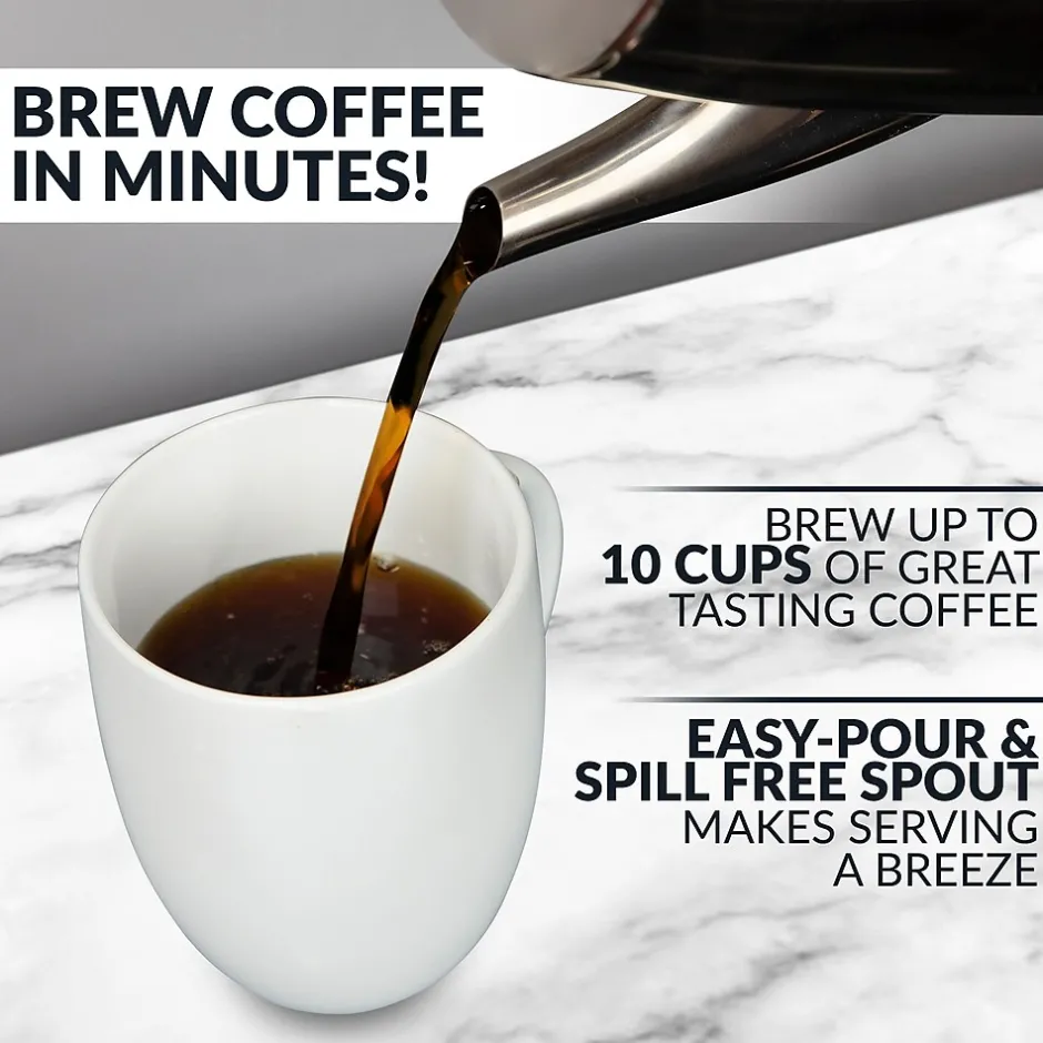 - GREAT TASTING COFFEE: Used with any type of ground coffee, this percolator brews up to 10 cups of great-tasting, rich coffee in just minutes – perfect for at home, the office, or small or large gatherings