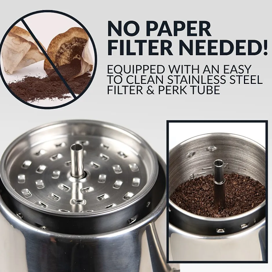 - NO PAPER FILTER NEEDED: Equipped with a easy-to-clean stainless steel filter and perk tube, no paper filters are needed