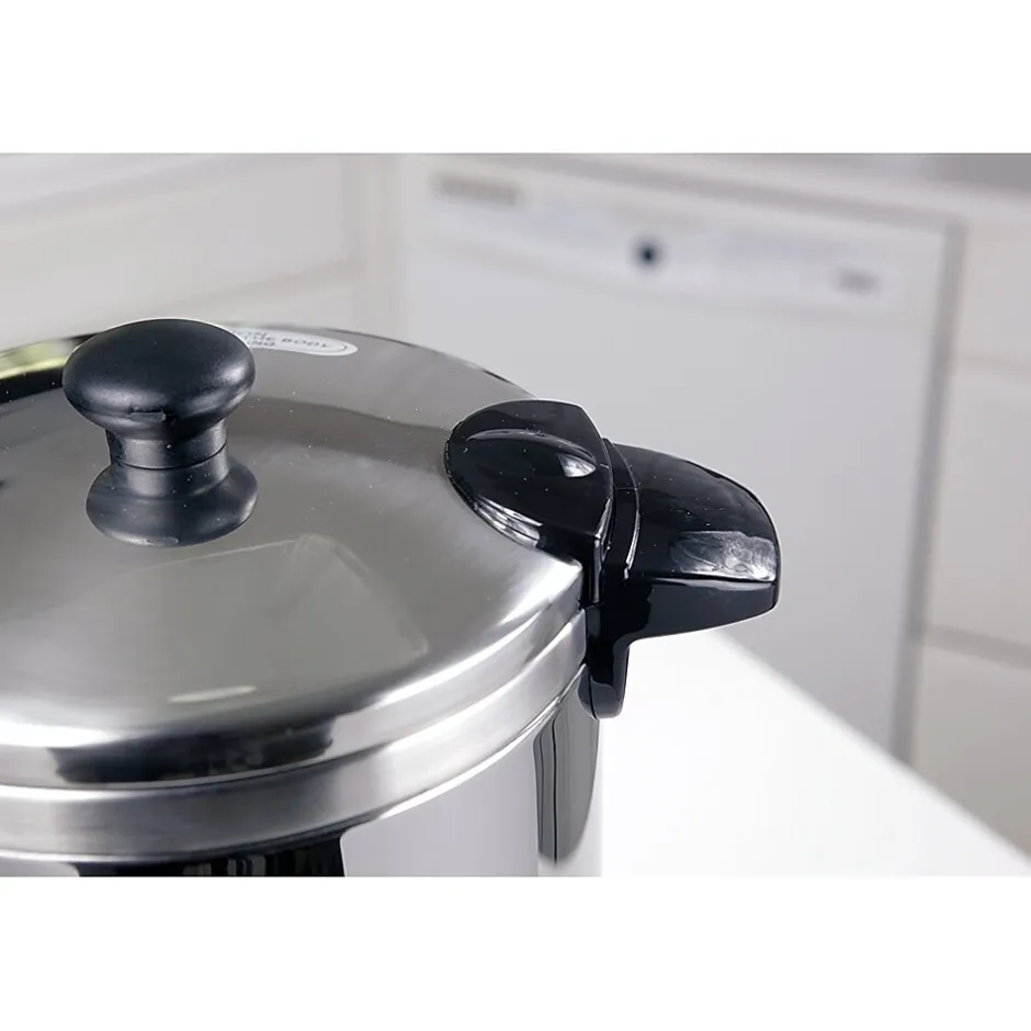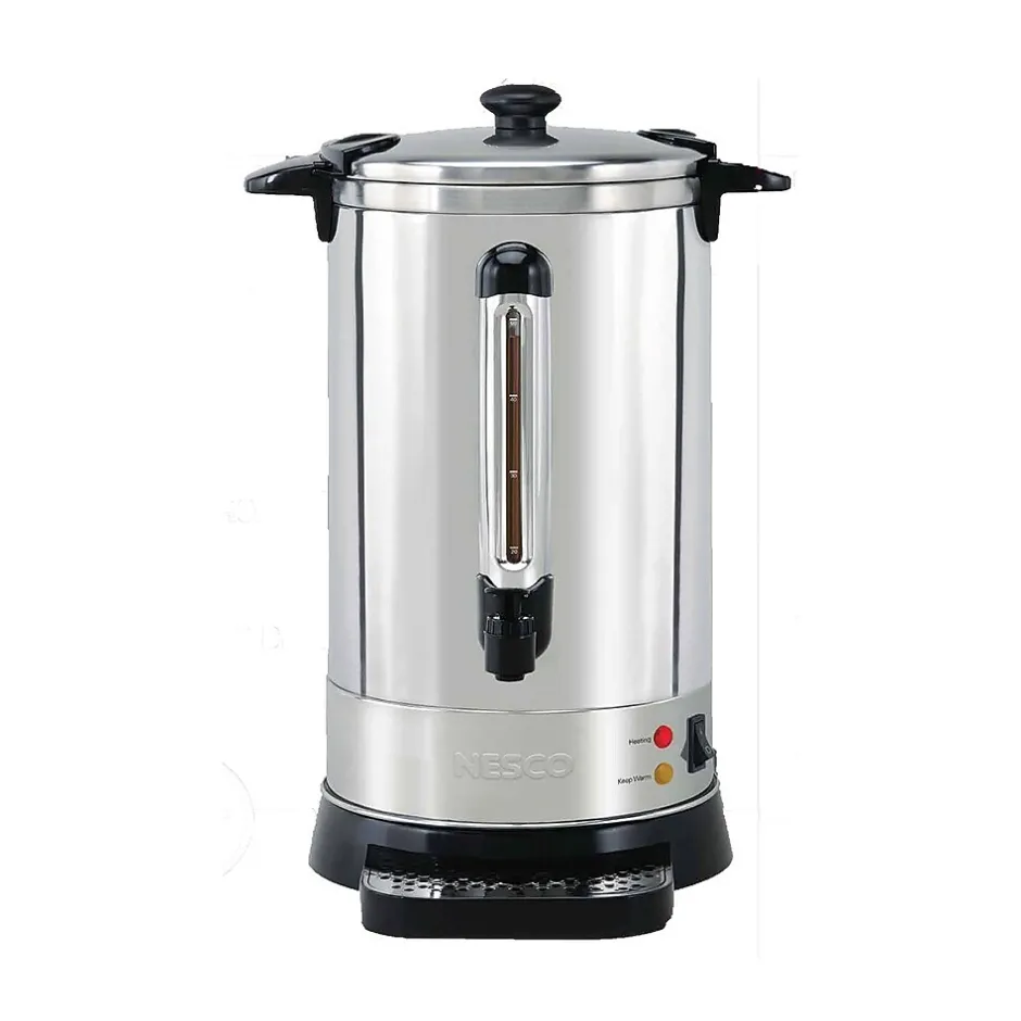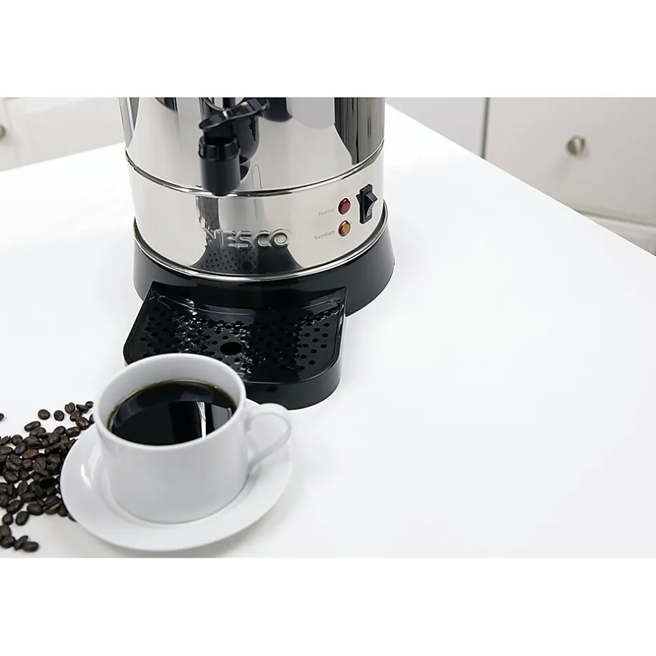 The Nesco Coffee Urn is constructed of stainless steel and features double wall insulation, allowing it to retain heat longer than single wall models. Its hefty capacity can hold up to 50-5.7 oz. cups. Approximate brewing time is one cup per minute. Green indicator light lets you know when coffee is ready to be served. With locking lid and stay-cool handles to help prevent mishaps, this urn is truly a crowd pleaser.