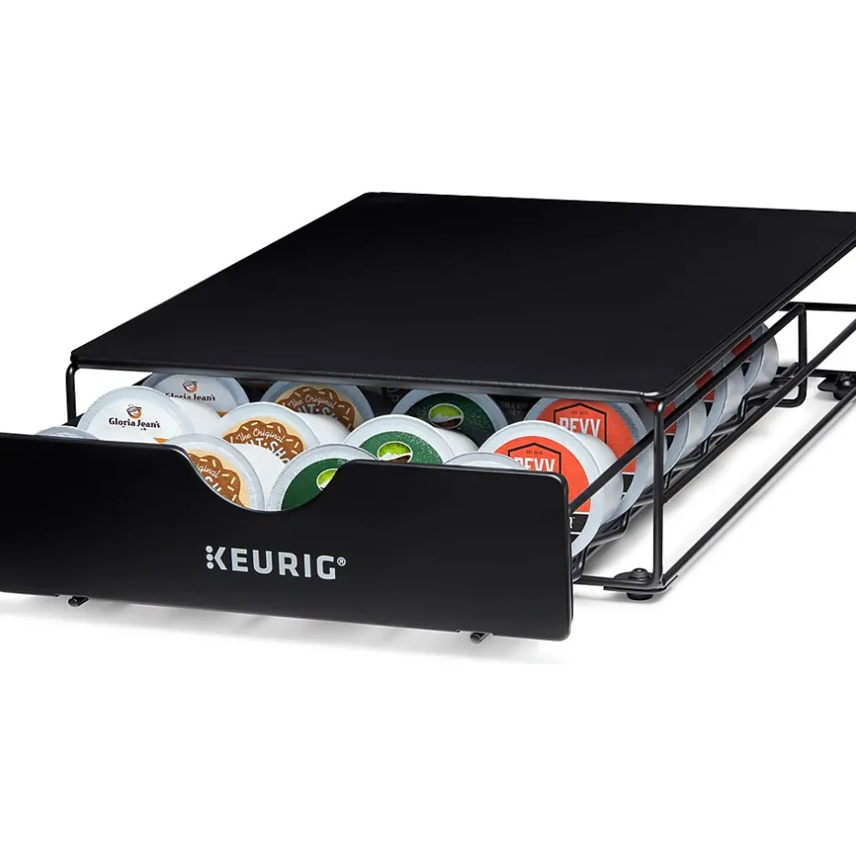The Keurig slim storage drawer is a small, space-saving pod storage solution. Its durable, stationary design provides easy access to 24 of your favorite K-Cup pods. The slim storage drawer fits conveniently underneath your Keurig coffee maker, keeping you organized without taking up any additional space on your countertop.