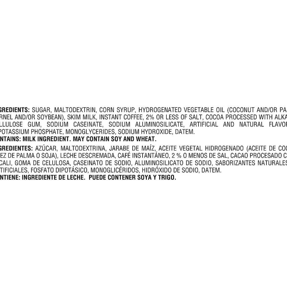 - Ingredients: sugar, maltodextrin, corn syrup, hydrogenated vegetable oil (coconut or palm kernel and/or soybean), skim milk, instant coffee, 2% or less of salt, cocoa processed with alkali, cellulose gum, caseinate, sodium aluminosilicate, artificial and natural flavors, dipotassium phosphate, monoglycerides, sodium hydroxide, DATEM