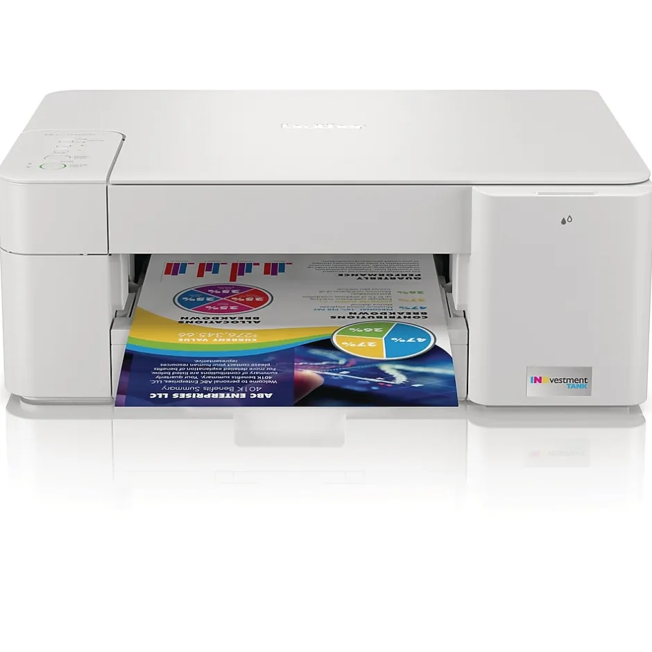 Brother INKvestment Tank MFC-J1205w wireless multifunction color inkjet printer is sleek, compact, and very affordable. This revolutionary printer features re-engineered high-capacity ink cartridges that provide up to one year of uninterrupted printing using only the cartridges included in-box. Print, copy, and scan features can be accessed from your mobile device through the Brother Mobile Connect app. Brother Mobile Connect has a user-friendly interface that gives you the freedom to print from virtually anywhere and always have access to the status of your printer’s ink usage. Brother Intelligent Page Gauge is a feature that can be accessed through the app, providing a visual, numerical way to know the amount of ink you’ve used and the amount of ink you have remaining. This wireless printer has multiple flexible connection options, including a built-in wireless interface for sharing with multiple users on your network, Wi-Fi Direct, or connect it locally to a single computer via a USB interface. The printer is easy-to-use, features a clean, modern design, offers quick setup and convenient optional printing via AirPrint and/or Email Print. When you need a reliable color inkjet printer at an affordable price to keep pace with your home or home office document needs, Brother INKvestment Tank MFC-J1205W is the printer for you. Includes a 2-year limited warranty with free online, live chat, or phone support for the life of your printer.