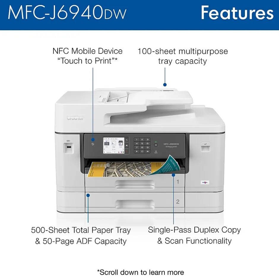 The Brother MFC-J6940DW color inkjet all-in-one printer delivers the functionality your office needs for optimum business performance. Print professional quality text and graphic documents at print speeds up to 28ppm(1) (black and color). A smart choice for businesses that need a printer to handle mixed media sizes; two, 250-sheet capacity paper trays(2) offer flexibility to print, copy, scan and fax on paper up to 11”x17″ (Ledger) size. Raising the bar with single-pass duplex copy and scan functionality. Use convenient NFC mobile printing(3) or access features on the go with the free Brother Mobile Connect App(4). Whether you print a little or a lot, our convenient Brother Refresh EZ Print Subscription Service erases the worry of running out of ink. The Brother MFC-J6940DW color inkjet All-in-One printer offers reliable, professional-quality printing for any small work group or small business.