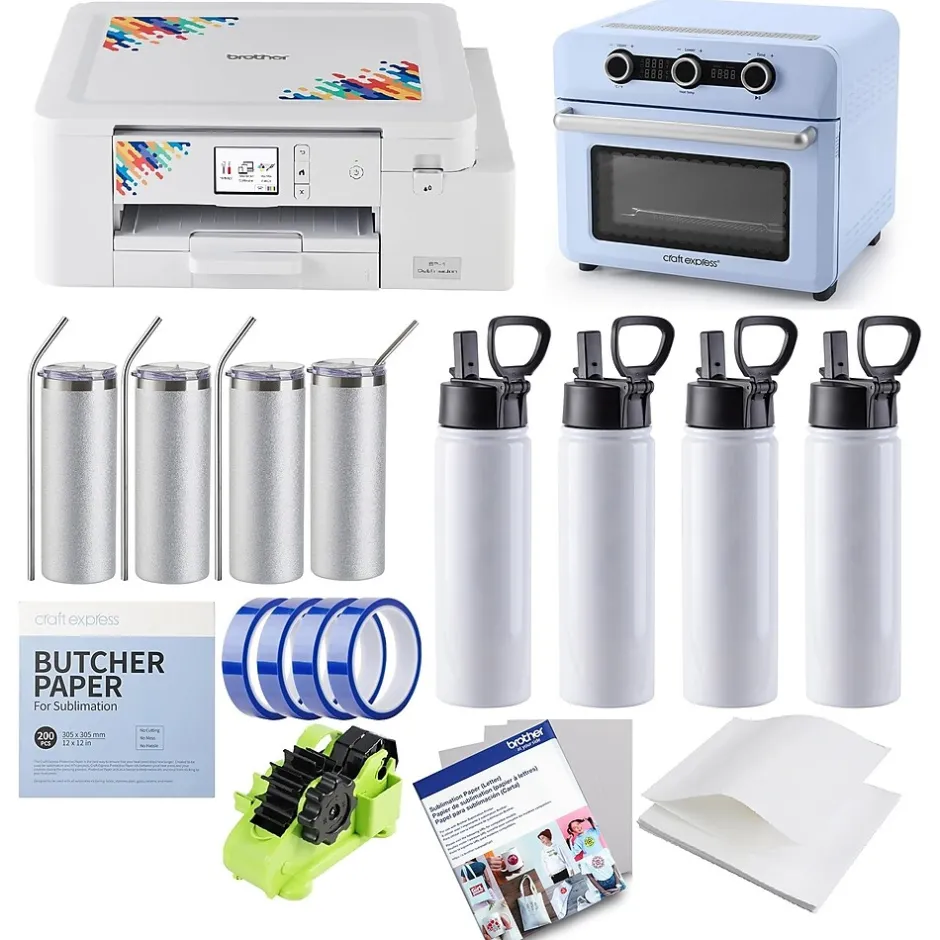 This DIY crafter’s bundle includes: Brother SP1 sublimation printer and 100 sheets 8.5″x11″ sublimation paper, Craft Express Elite Sublimation Oven, 4-pack 20oz silver glitter stainless steel tumblers, 4-pack 18oz stainless steel water bottles, 4 rolls heat-resistant tape, thermal tape dispenser, 200 sheets 12″x12″ butcher paper, 50 shrink film sleeves.