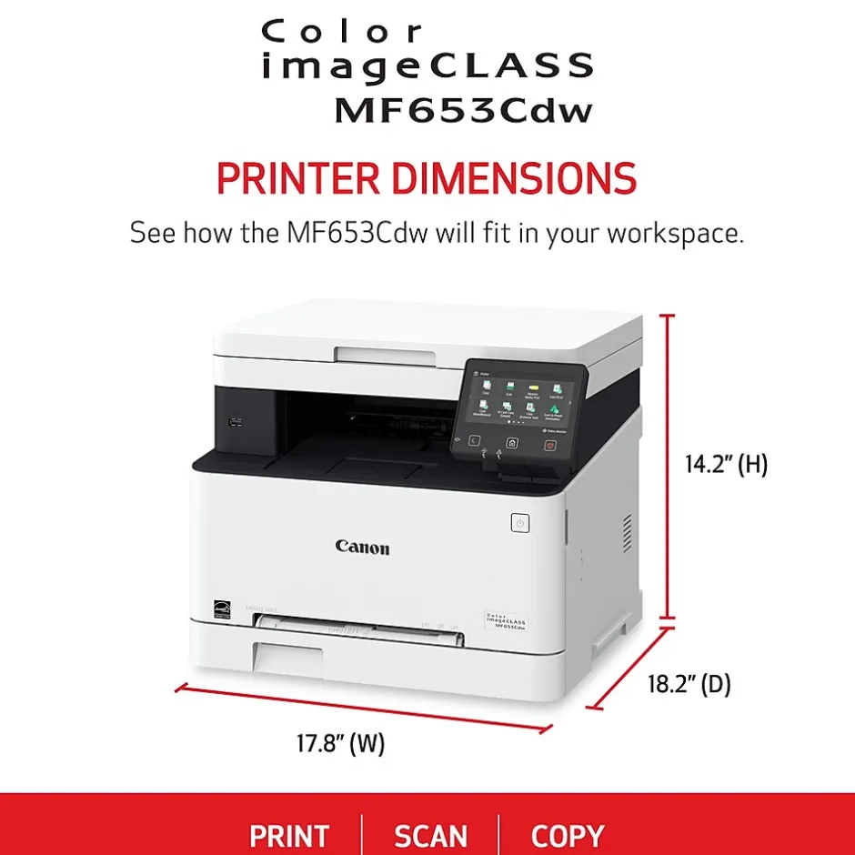 Canon Color imageCLASS’s diverse features and durability give you the confidence and flexibility to print everything from beautiful photos to impressive documents at home and in your small office. The MF653Cdw offers print, scan, and copy capabilities and can print up to 22 pages per minute. High-capacity toner option keeps up with your printing needs and limits toner replacement interruptions. Connect this printer to a wireless network in four simple steps. Print on the go with Canon PRINT Business, Apple AirPrint, and Mopria Print Service. Compatible with Windows, macOS, and ChromeOS. Features a compact design.